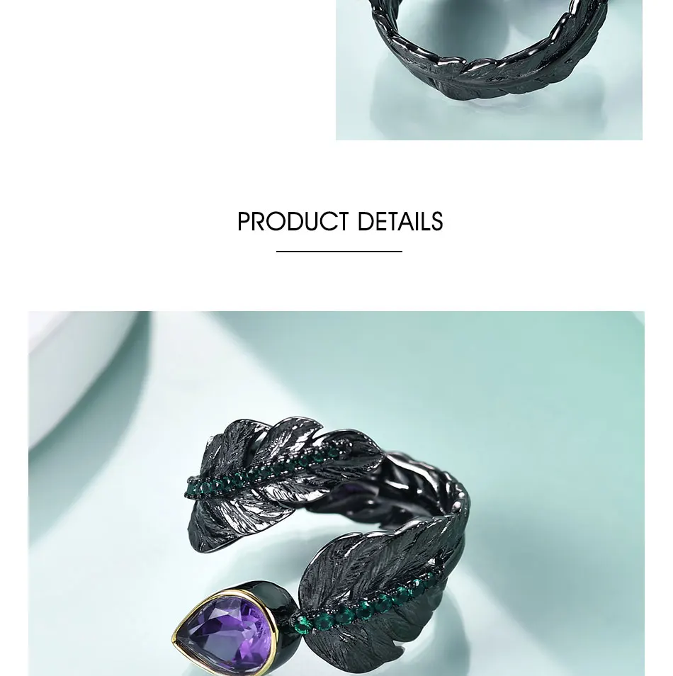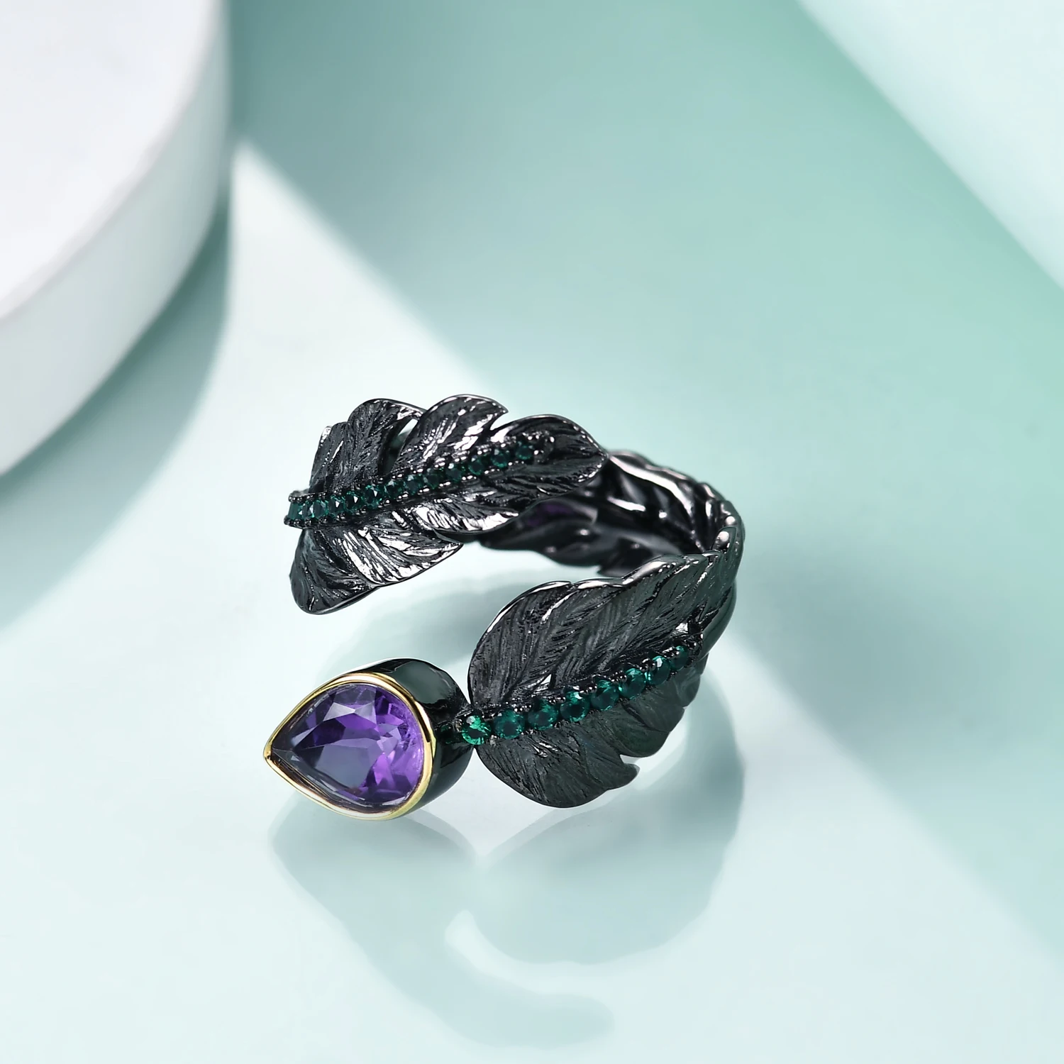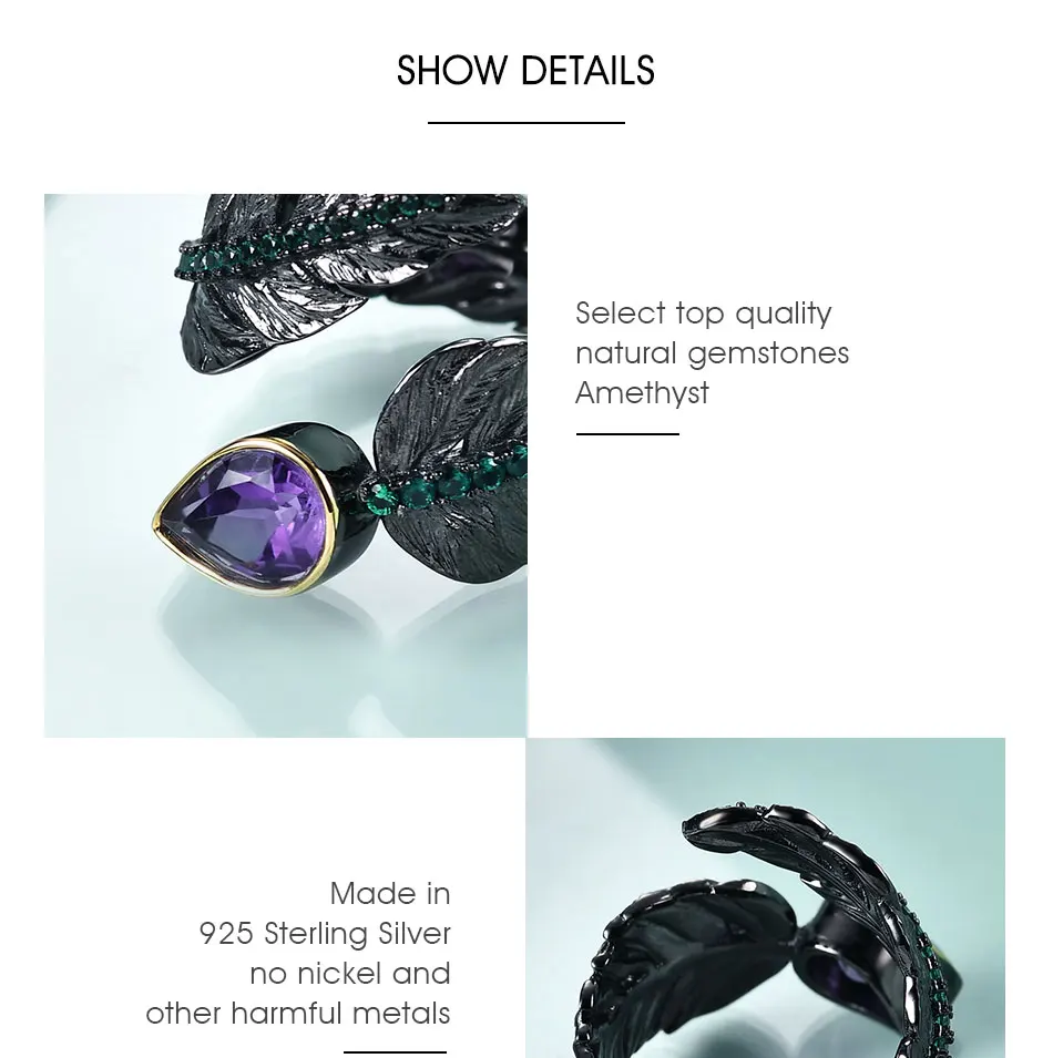 Женские кольца ручной работы из серебра 925 пробы, с перьями и натуральным аметистом