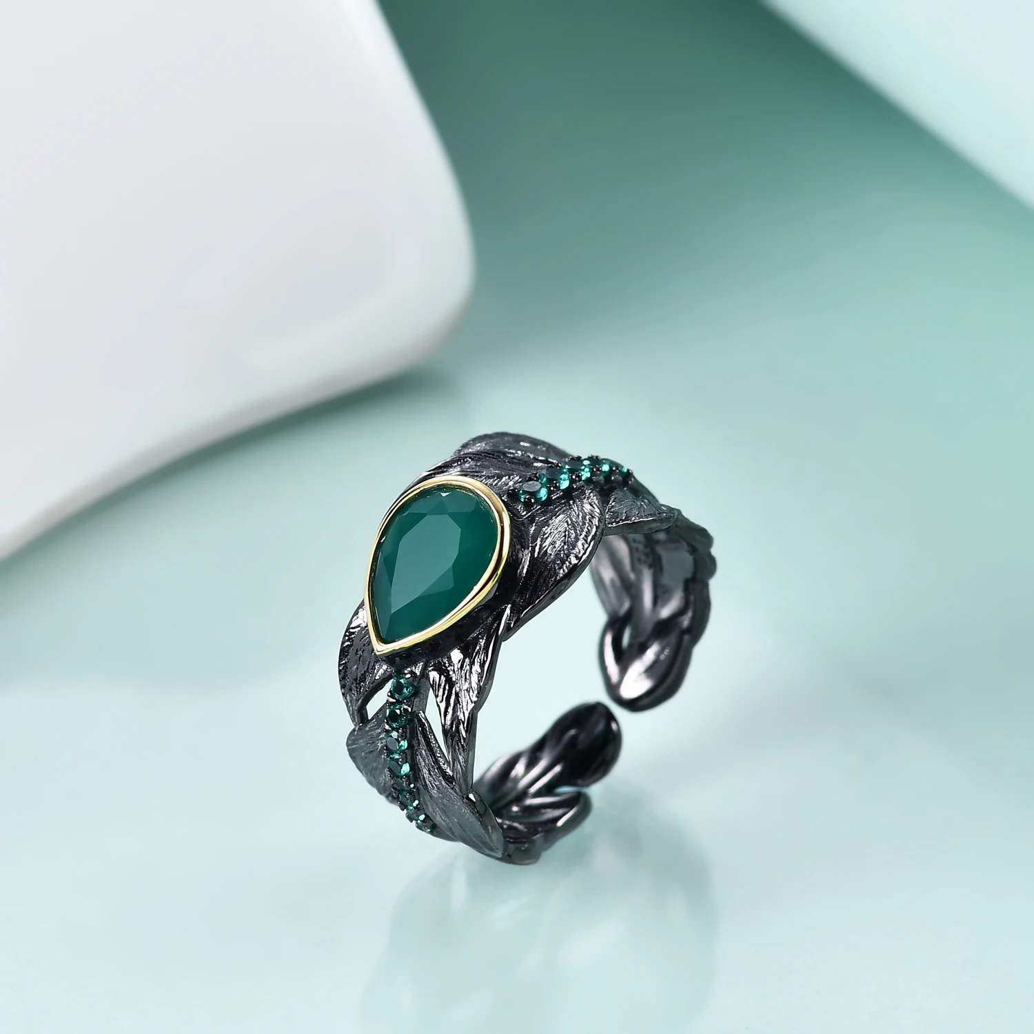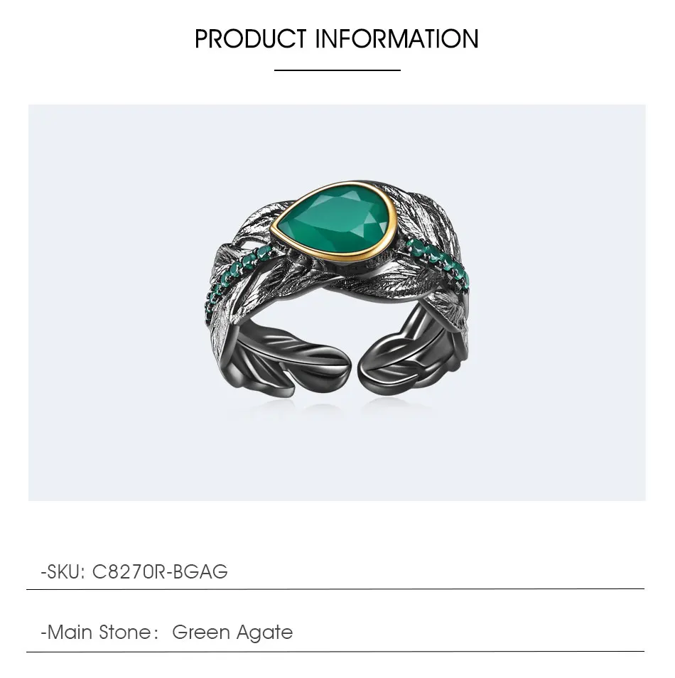 Женское кольцо из серебра 2021 пробы с зеленым агатом и перьями