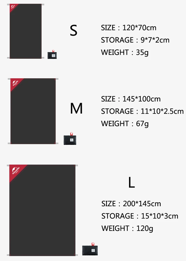 Название продукта: коврик для пикника NaturehikeЦвет: черныйРазмер: S: 120*70 см/М: 145*100 см/Д: 145*200 смСкладной Размеры: S: 9*7*2 см/m: 11*10*2,5 см/L: 15*10*3 смМатериал: 20D двусторонняя силиконовая клетчатая ткань с покрытиемПрименение: кемпинг, пикник, открытый, туризм, домХарактеристики: портативный, прочный, водонепроницаемыйНе только наземный лист, но и может использоваться в качестве солнцезащитного козырька (необходимо купить опорные стержни и ветрозащитные веревки)