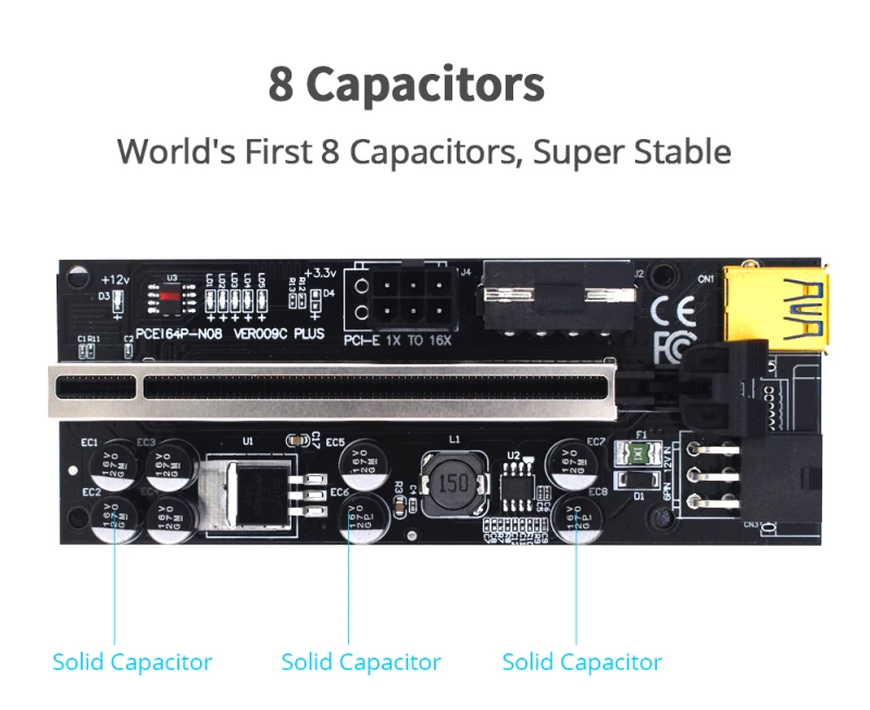 На этой плате PCI-E с 1X по 16X есть 4 конденсатора, чтобы сделать источник питания стабильным и надежным.