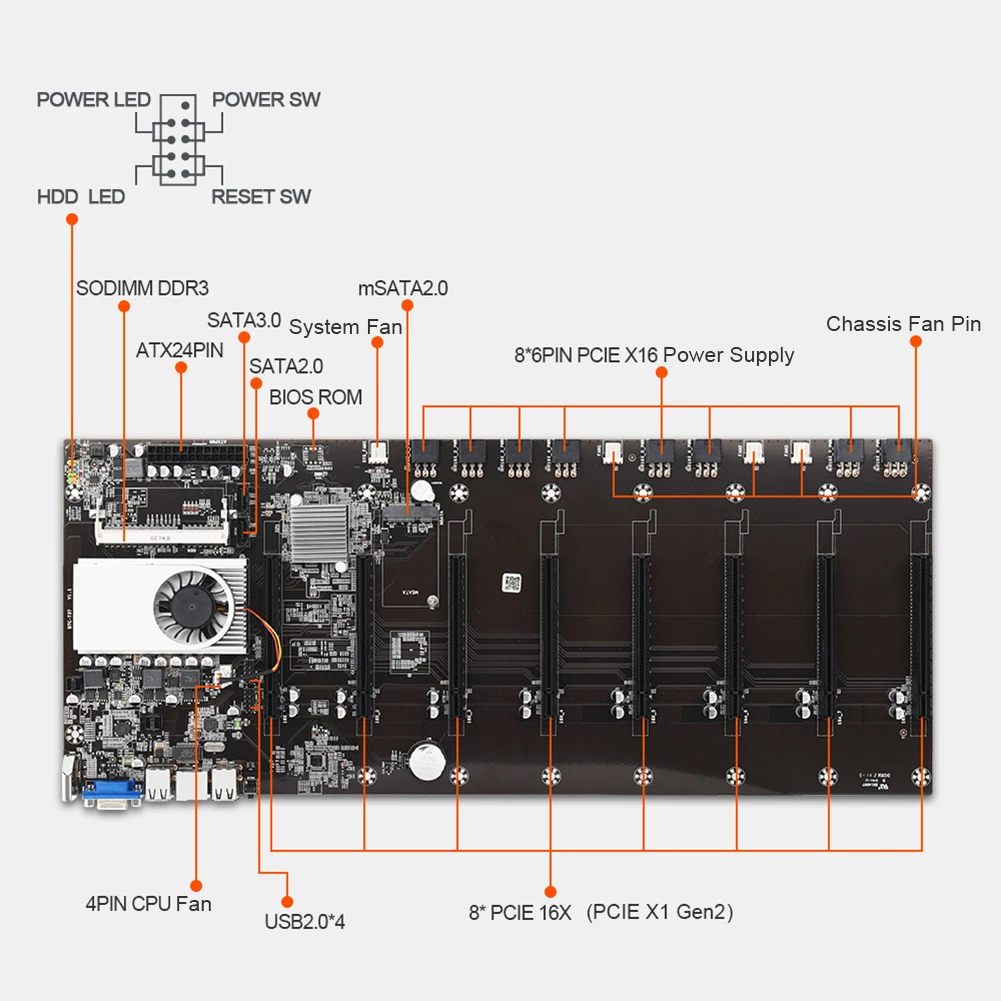 Слот для памяти: 8 разъемов для видеокарт, включая HDMI-совместимый + VGA + 2 * SATA + mSATA 3,0 + 8 * PCIE 16X.