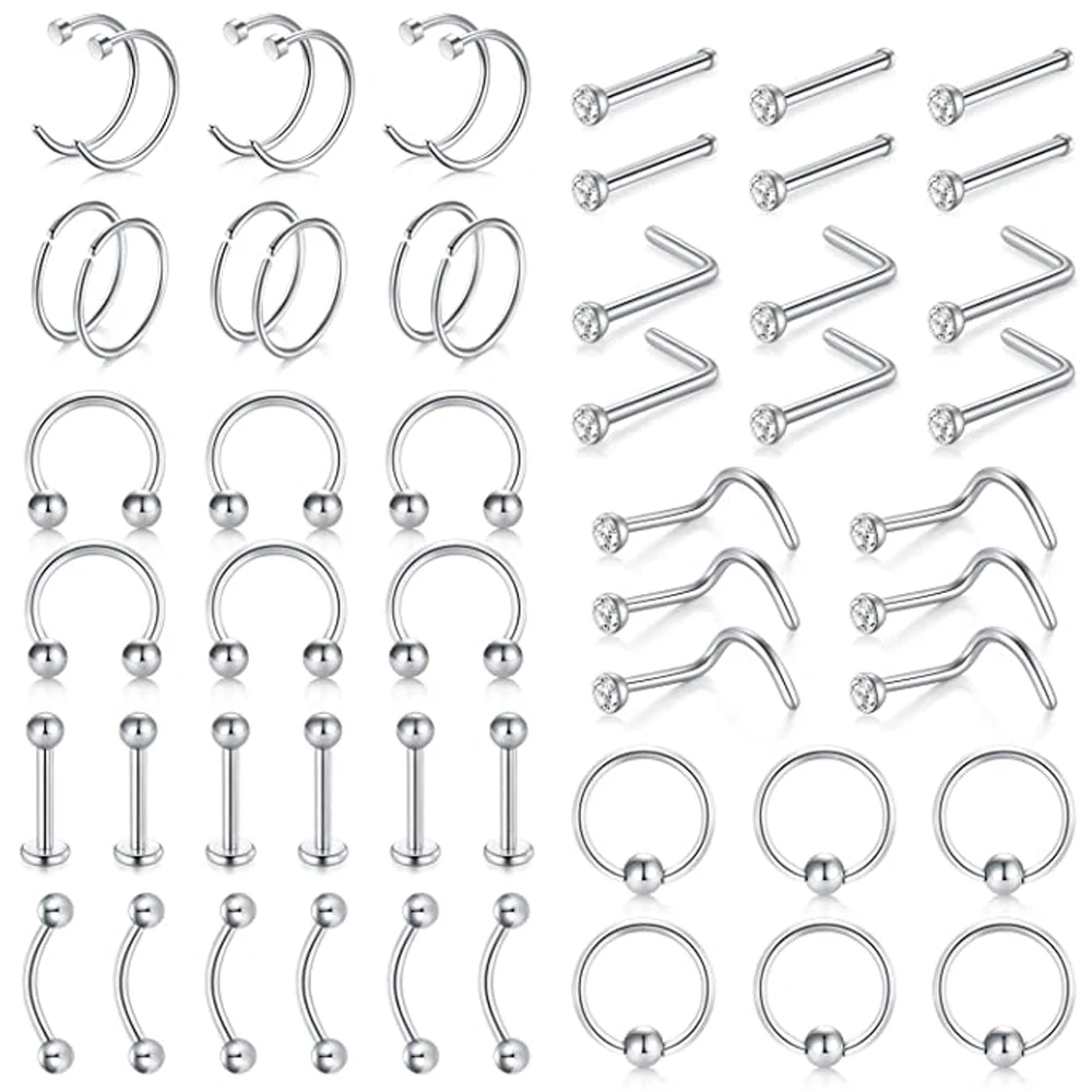 Набор для пирсинга тела из хирургической нержавеющей стали, серьги-кольца для носа, губ, бровей, перегородки, языка, соска, живота, обруч, серьги, пирсинг