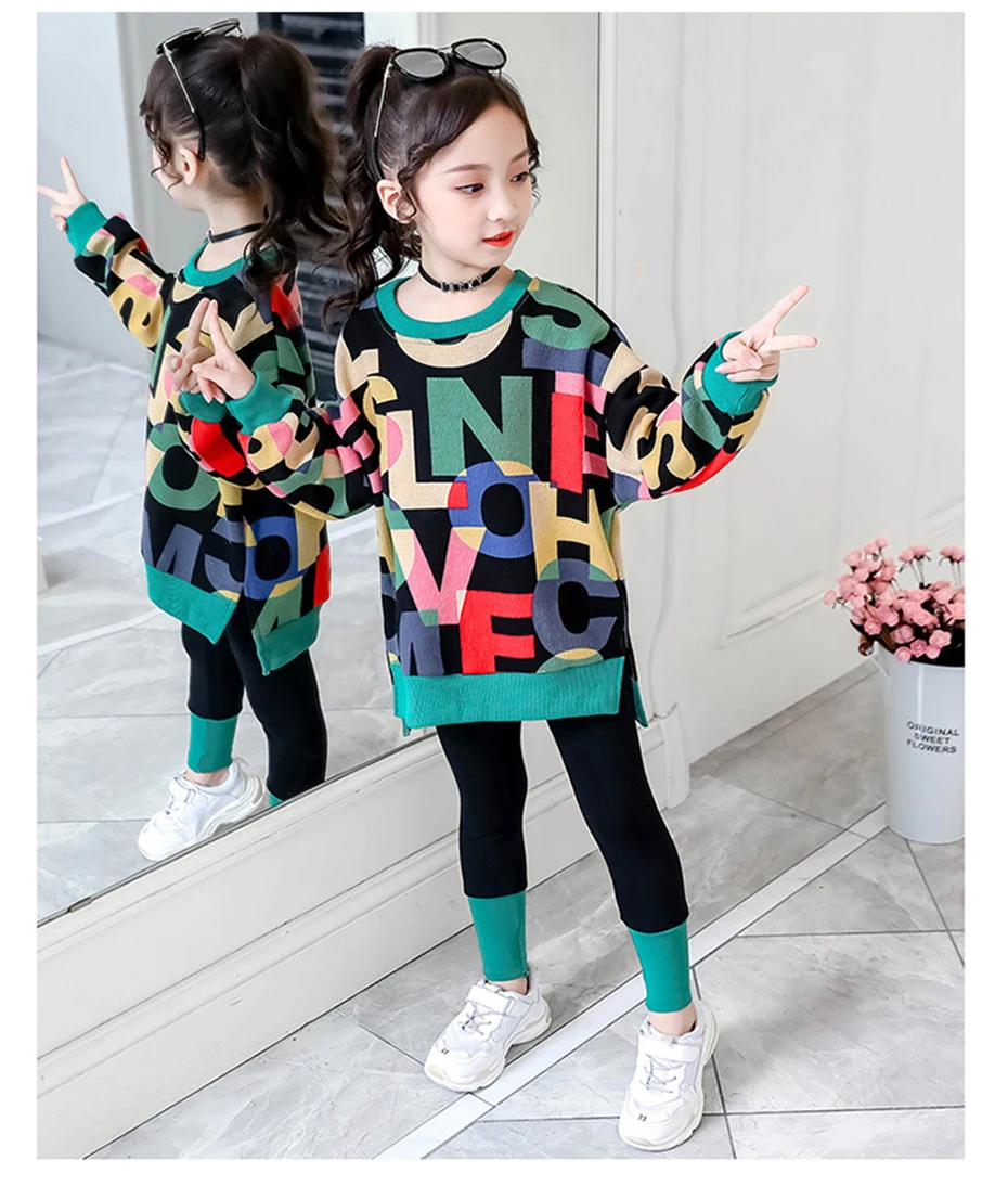 Комплект одежды для девочек 5-12 лет, из свитера с надписью и брюк