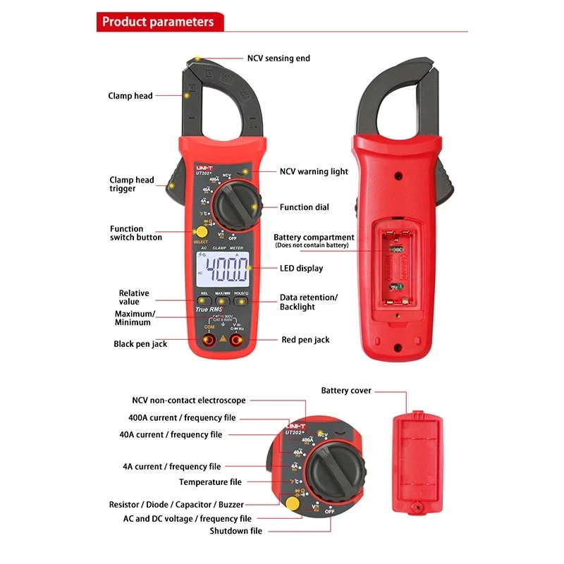 UT202A + 600V AC DC измерение напряжения, 600A AC Измерение тока, Макс/мин/true RMSФункция: AC/DC напряжение, измерение переменного тока, диодный тест, сопротивление, непрерывный зуммер, фракция переменного тока, подсветка