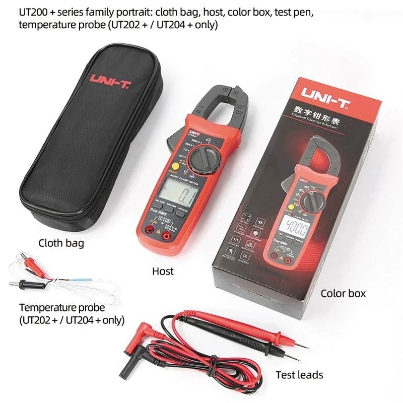 UT202 + :600V AC/DC измерение напряжения, 400A AC Измерение тока, температурный тест, тест емкости 4mFФункция: напряжение переменного/постоянного тока, измерение переменного тока, непрерывный зуммер, диод, тест на реситанцию, Макс/мин данные, REL ,True RMS, подсветка, частота, тест емкости, температурный тест