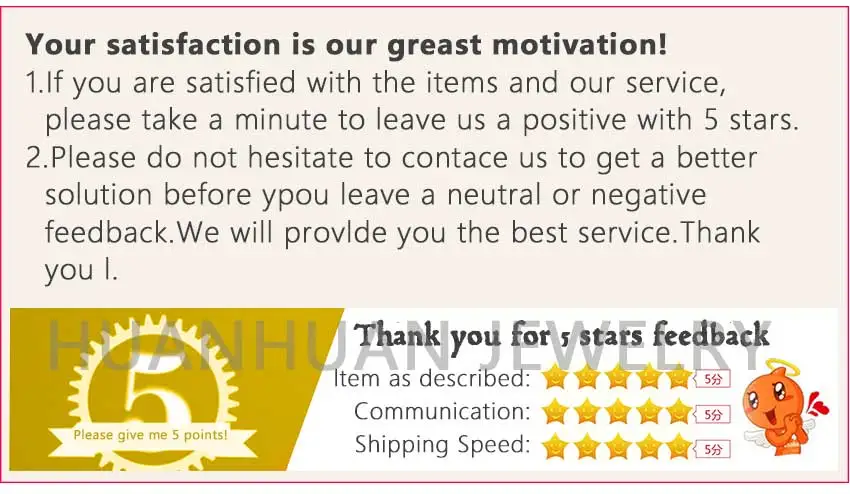 Наша успех зависит от вашего удовлетворения, поэтому отзывы очень важны для нас, пожалуйста, оставьте нам хорошие отзывы, если вы удовлетворены нашими товарами и обслуживанием, мы сделаем это для вас. Большое спасибо!