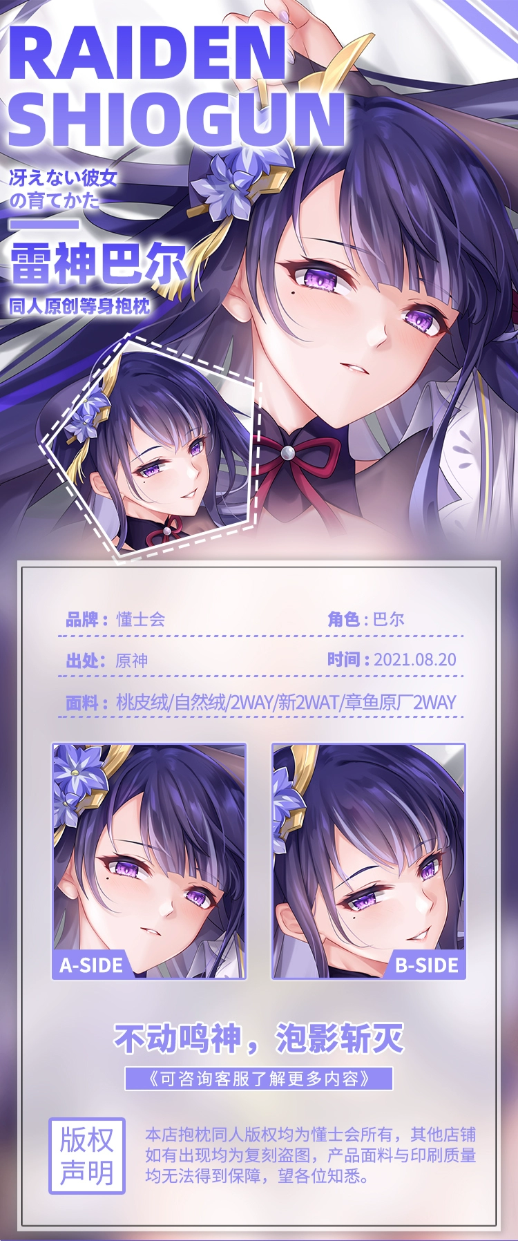 Чехол для подушки Game Genshin Impact Raiden Shogun Baal Dakimakura, 2 способа обнимания