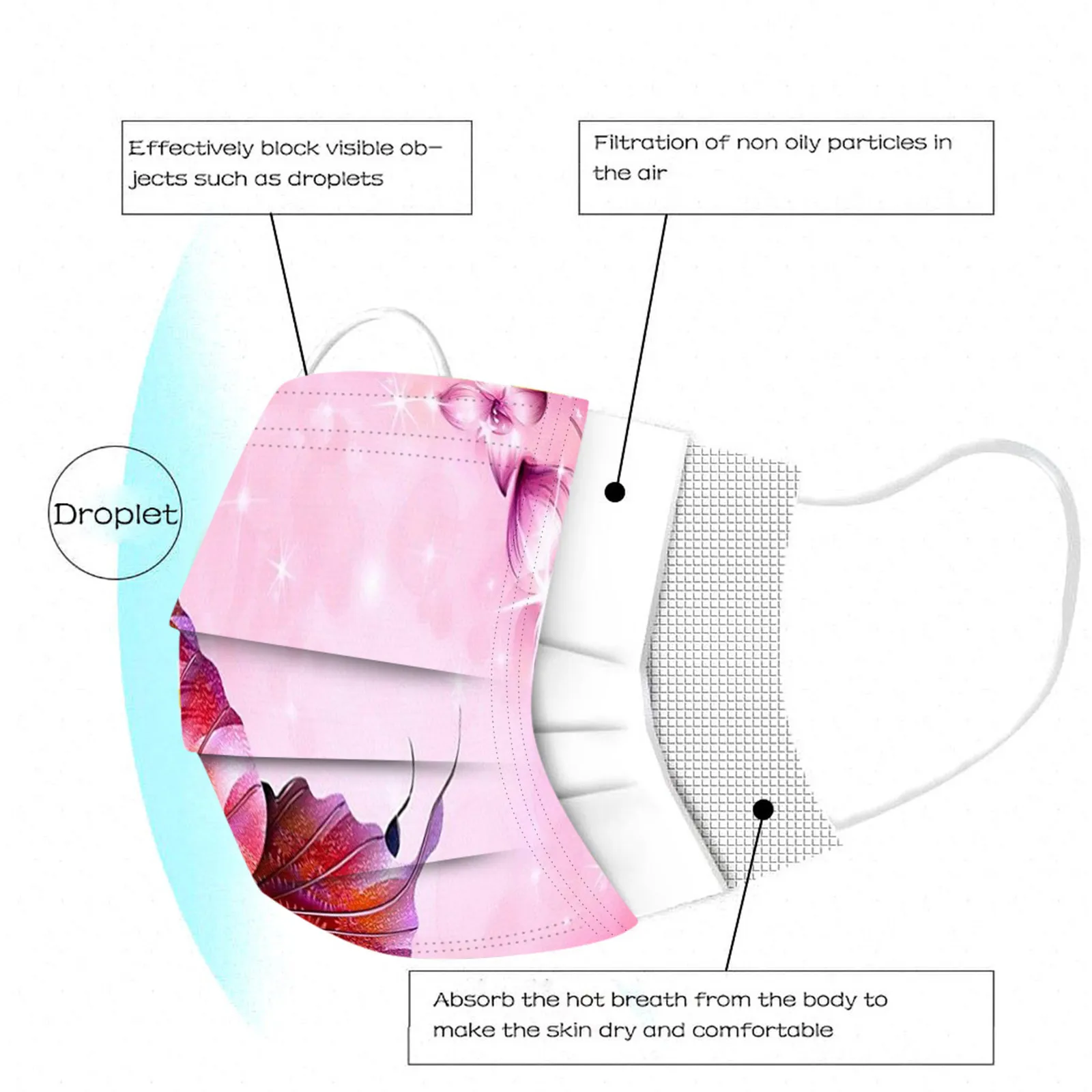 ВОдноразовая маска изготовлена из 3 слоев нетканого материала,Безопасен и безопасен для использования. Дышащий материал и красивыйУзоры, которые делают его полезным и модным. Специальный 3 слоя из нетканого материалаДизайн, обеспечивает некоторую защиту от пыли, автомобильных выхлопных газов,Пыльца и т. д. эластичная Ушная петля, легко носить и не давит на уши.