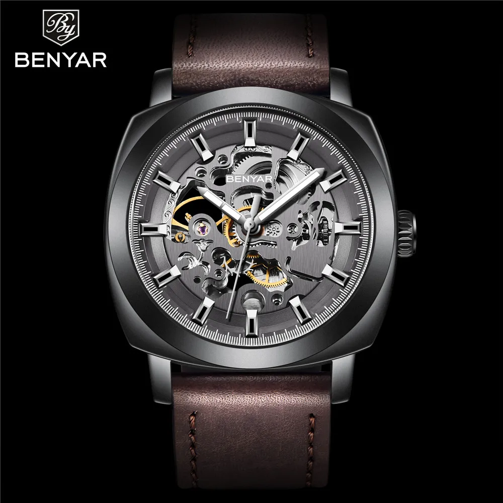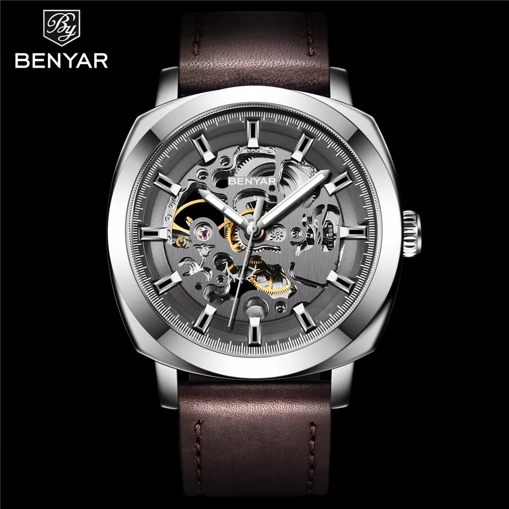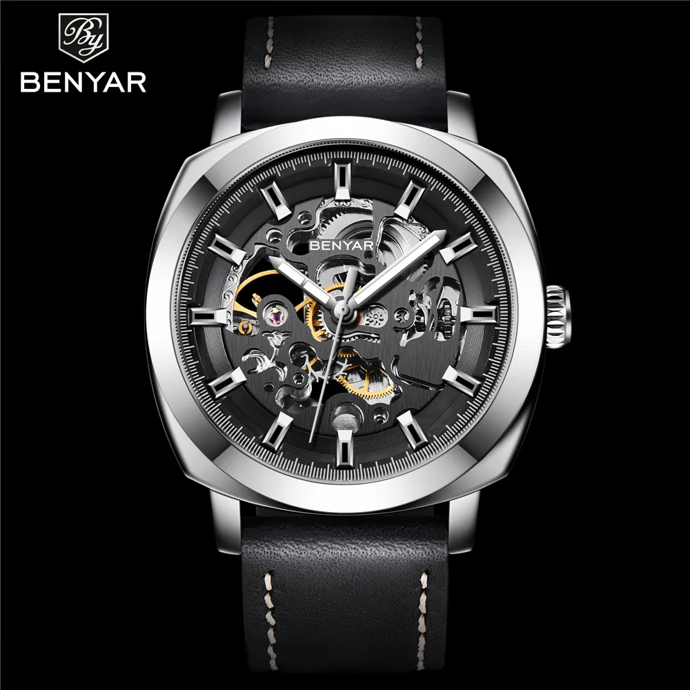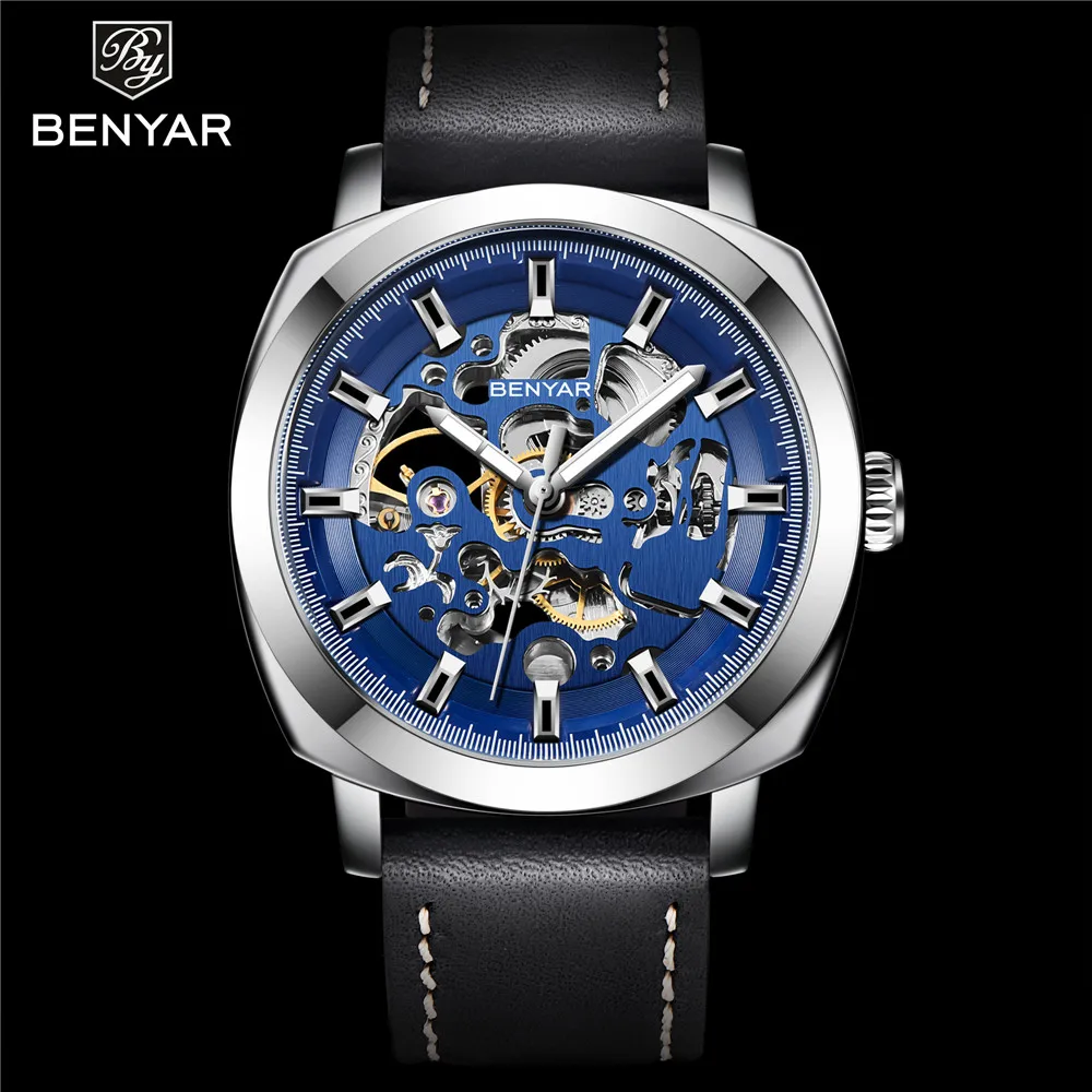 Мужские автоматические часы BENYAR, водонепроницаемые, с полым циферблатом из нержавеющей стали, 45 мм