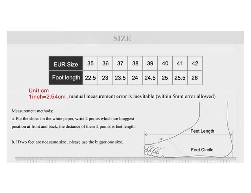 Сначала прочно Встаньте на пол, чтобы измерить самую длинную часть стопы, затем используйте данные по длине стопы, чтобы узнать соответствующий размер обуви в таблице размеров ниже.1. Длина стопы в таблице размеров означает, что используйте эту длину стопы, чтобы выбрать подходящий размер. Длина стопы, не длина стельки, не длина подошвы.2. Пожалуйста, выбирайте размер в соответствии с длиной Вашей стопы (Не выбирайте размер в соответствии с вашим обычным размером обуви!)3. Из-за отличий дисплея и угла съемки цвет может немного отличаться от реального.