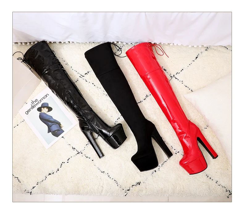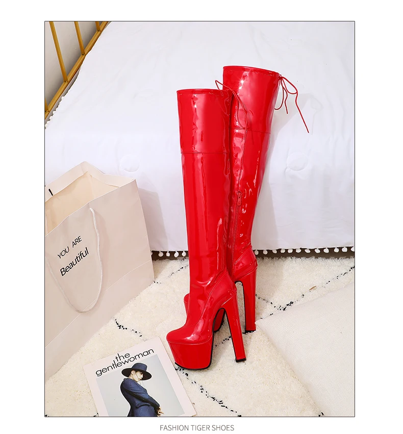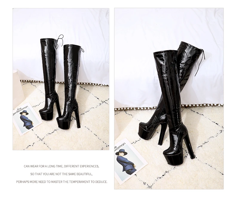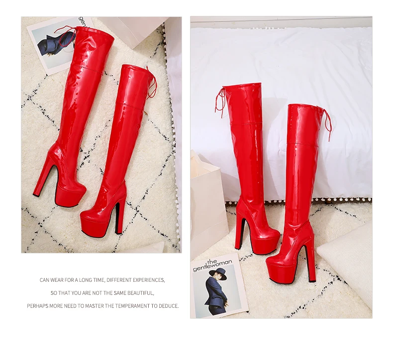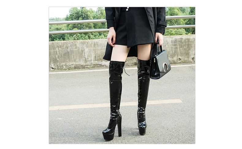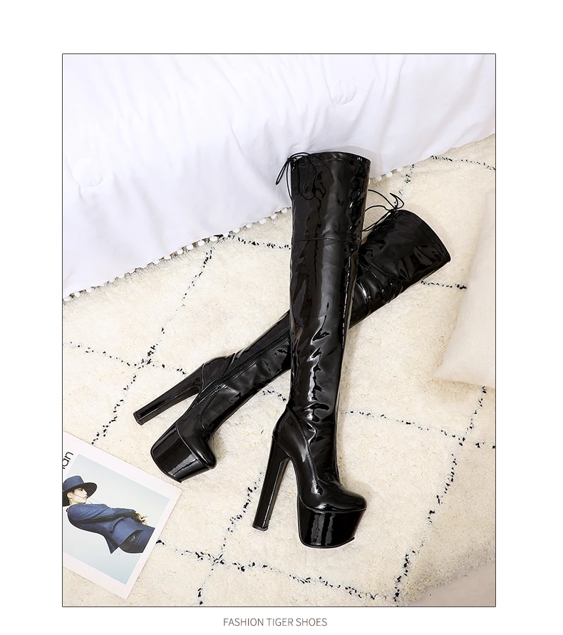 Женские ботфорты из лакированной кожи на очень высоком толстом каблуке больших размеров эластичные сапоги из флока на водонепроницаемой платформе с высоким голенищем