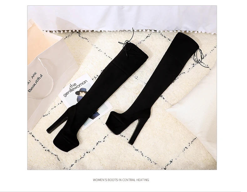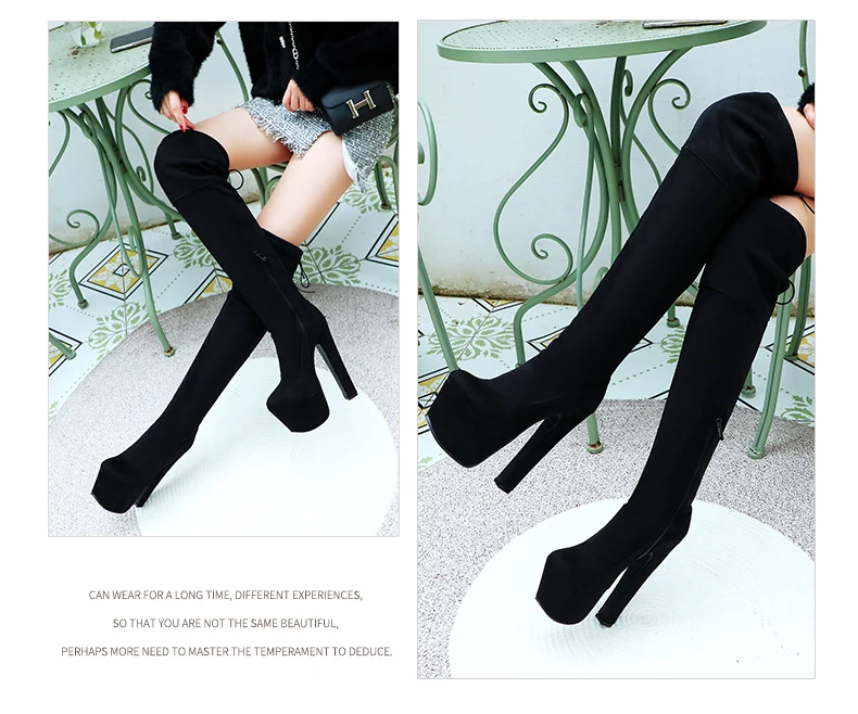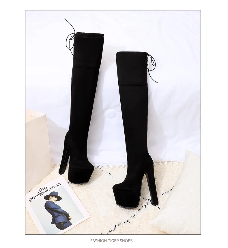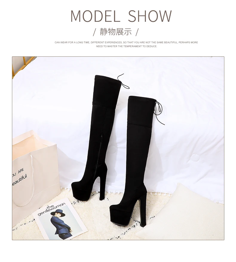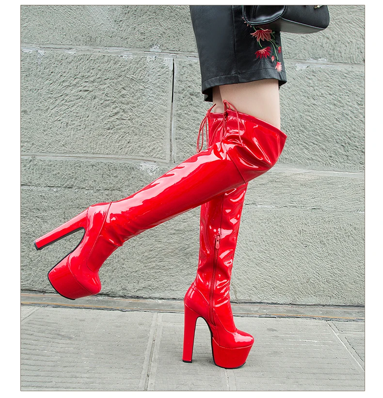Женские ботфорты из лакированной кожи на очень высоком толстом каблуке больших размеров эластичные сапоги из флока на водонепроницаемой платформе с высоким голенищем