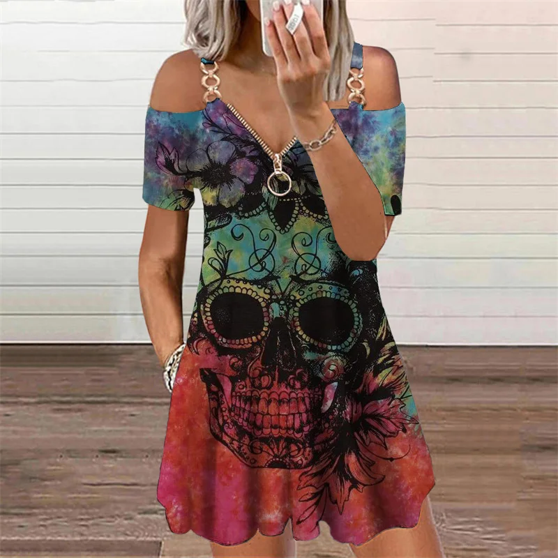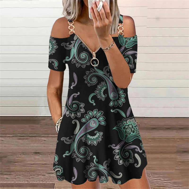 Женское платье с цветочным принтом, повседневное свободное платье на молнии с V-образным вырезом, мини-платье большого размера, лето 2021