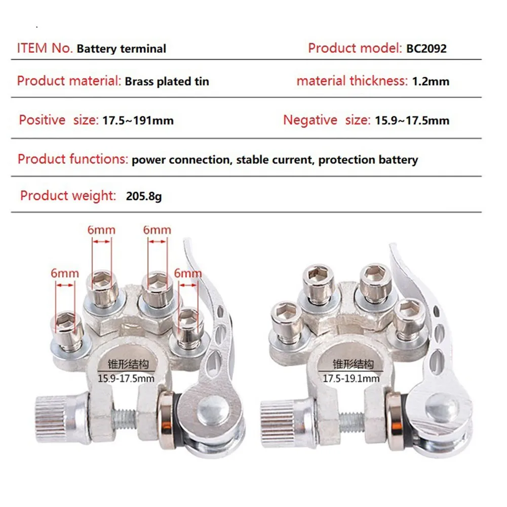 Спецификация:* Название продукта: автомобильный аккумулятор* Модель продукта:BC2114* Материал изделия: латунь (винт-железо)* Процесс продукта: процесс ковки* Функция продукта: подключение к питанию, стабилизация тока, Защита аккумулятора, предотвращение утечкиПосылка:2 * терминал
