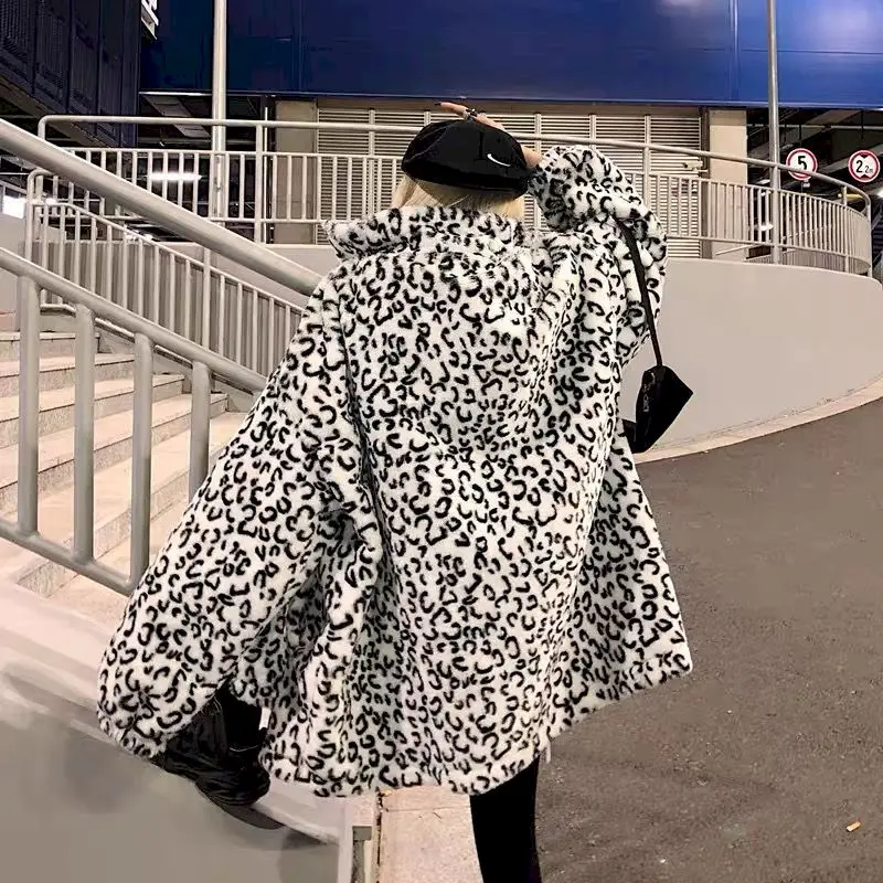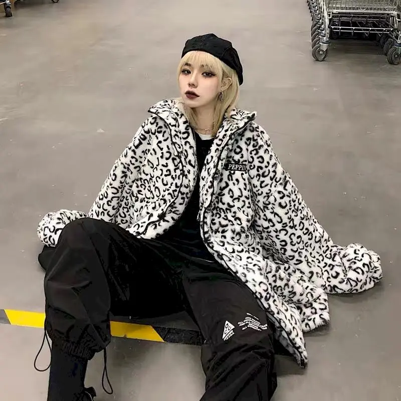Зимнее пальто из искусственного меха с леопардовым принтом, модная свободная теплая куртка в стиле Харадзюку, уличная одежда в стиле хип-хоп, утепленная верхняя одежда большого размера, 2022