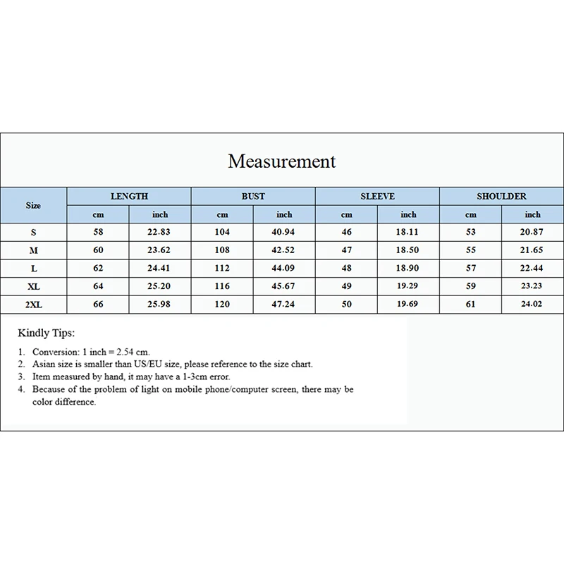 1. Пожалуйста, внимательно проверьте таблицу размеров перед покупкой товара. Если вы не знаете, как выбрать размер, пожалуйста, свяжитесь с нашей службой поддержки клиентов
