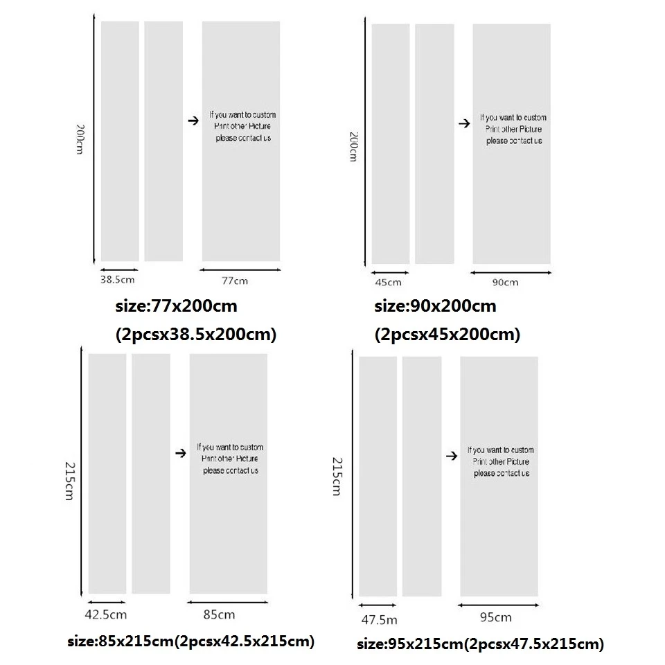 Материал: экологически чистый водонепроницаемый ПВХРазмер продукта:77 см * 200 см/2,53 футов * 6,56 футов/комплект (1 комплект = 2 штуки 38,5x200 см)85 см * 215 см/2,79 футов * 7.05 футов/комплект (1 комплект = 2 штуки 42,5x215 см)90 см * 200 см/2,95 футов * 6.56 футов/комплект (1 комплект = 2 шт. 45x200 см)95 см * 215 см/3,12 футов * 7,05 футов/комплект (1 комплект = 2 штуки 47,5x215 см)Примечание: мы можем предоставить специальный размер наклейки двери вы хотите, пожалуйста, свяжитесь с нами.
