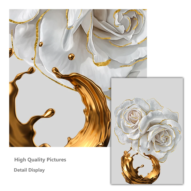 Poster Canvas PaintingWhite Rose Flower Golden Ink Splash Abstract Poster Nordic Art Plant Canvas Painting Modern Wall Picture for Living Room Decor