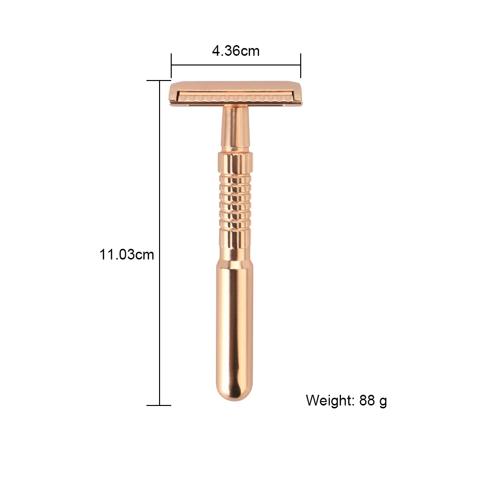 Бритва с двойными краями имеет нескользящую ручку. Он изготовлен полностью из металла и рифленый, чтобы обеспечить плотное сцепление. Металл был использован человеческим человеком на протяжении многих лет из-за его долговечности и прочности.