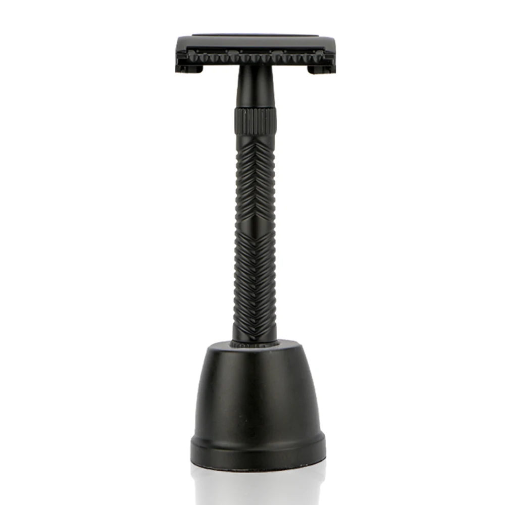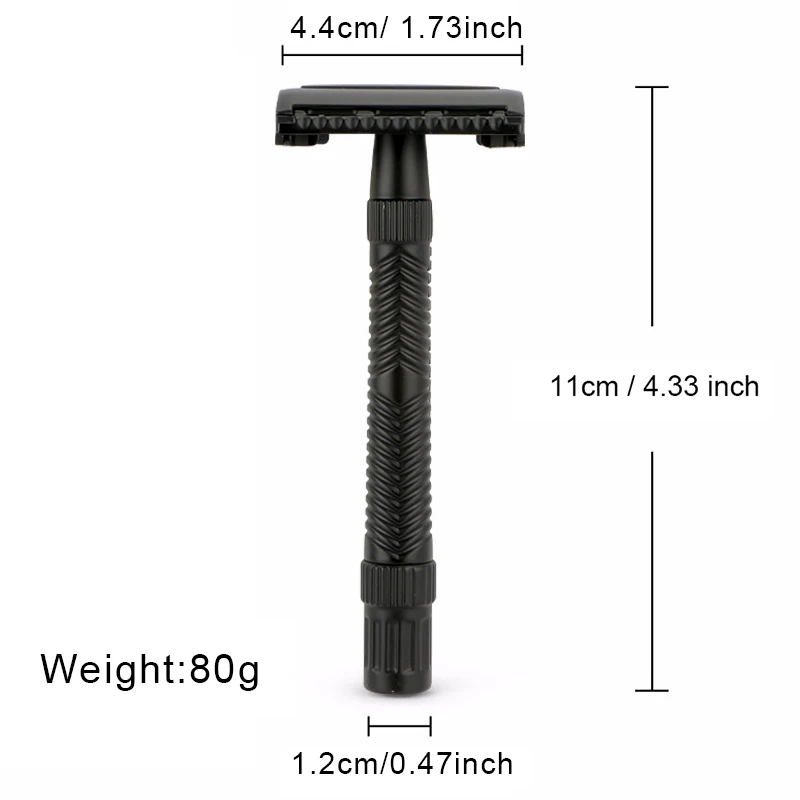 Бритва с двойными краями имеет нескользящую ручку. Он изготовлен полностью из металла и рифленый, чтобы обеспечить плотное сцепление. Металл был использован человеческим человеком на протяжении многих лет из-за его долговечности и прочности.