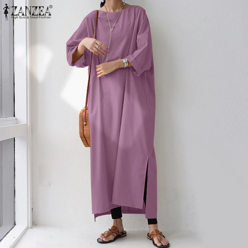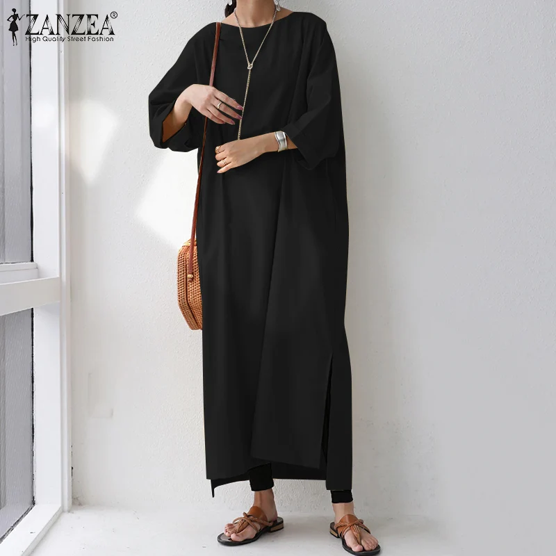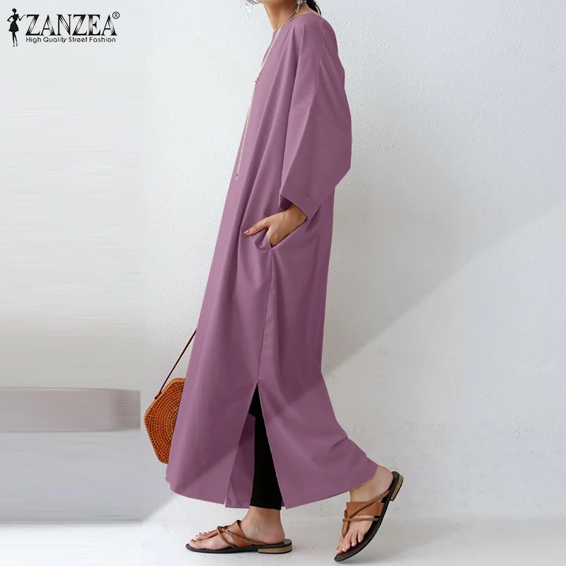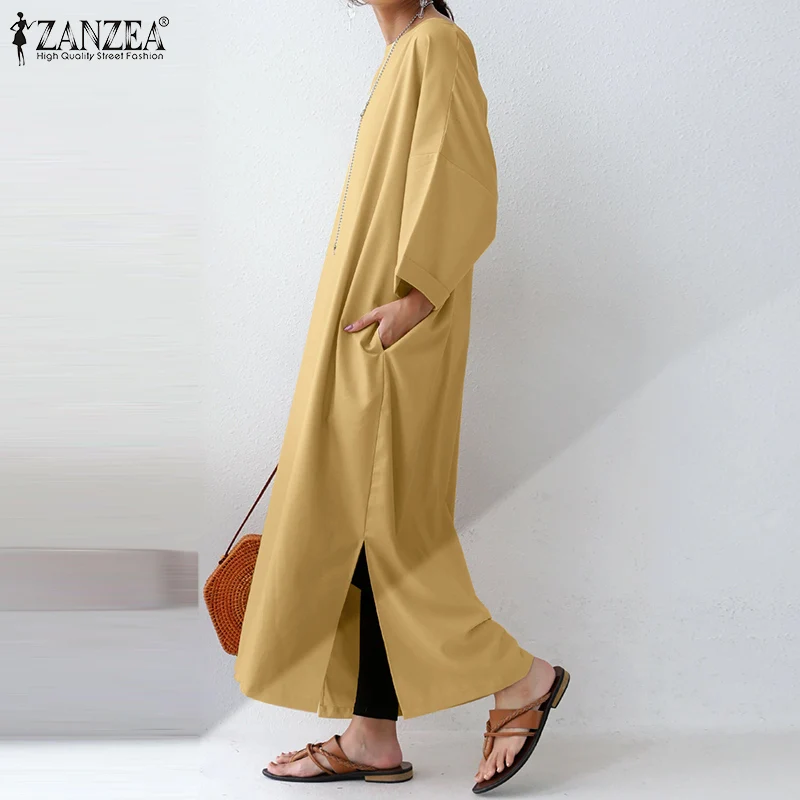 Женский однотонный Длинный Сарафан ZANZEA с длинным рукавом, осеннее платье оверсайз, повседневные свободные платья с разрезом и подолом, женское платье, мешковатые платья