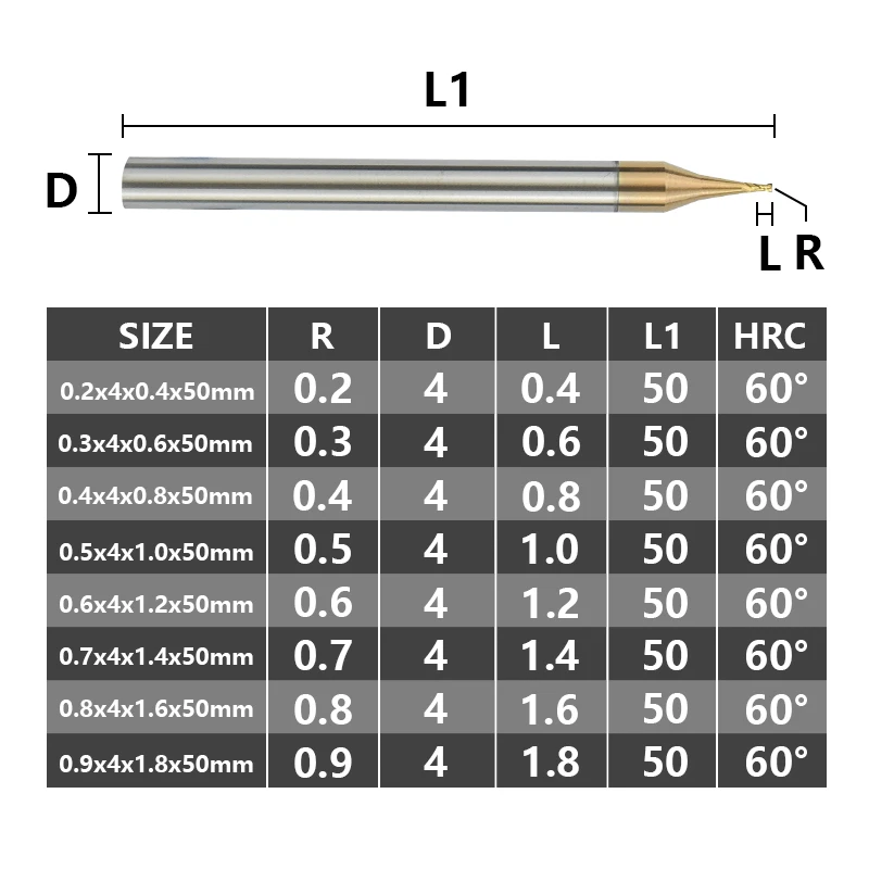 Фреза с 2 канавками 0,2-0,9 мм, хвостовик 4 мм, ЧПУ, вольфрам фрезерный инструмент твердосплавный