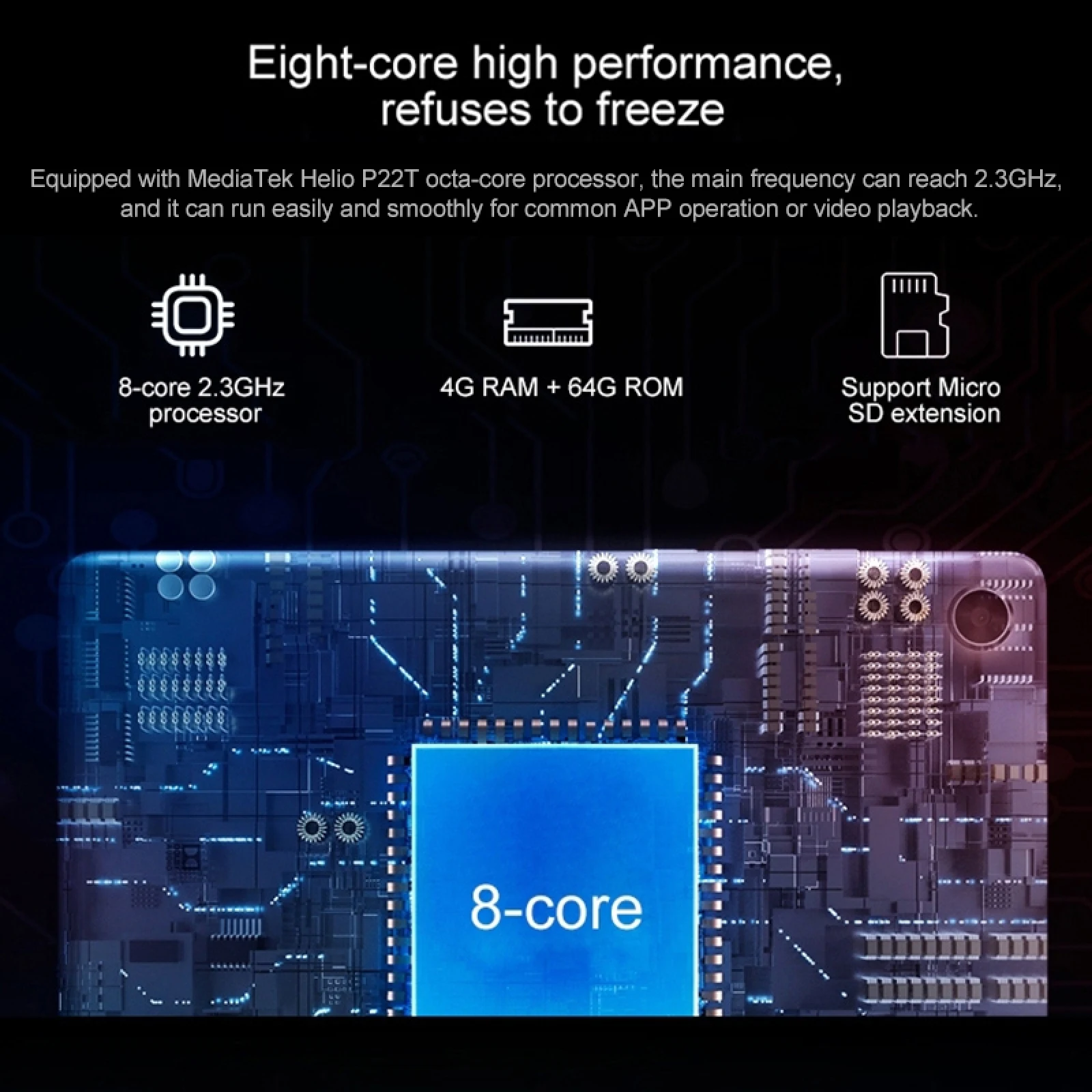 1. Процессор: Helio P22T 8-ядерный (4x2,3 ГГц + 4x1,8 ГГц)2. Операционная система Android 9,0 Pie.3. 8,0 дюймов IPS 1920x1200 FHD экран4. Поддержка dolby стерео звука и идентификации лица5. Питание от аккумулятора 5100 мАч