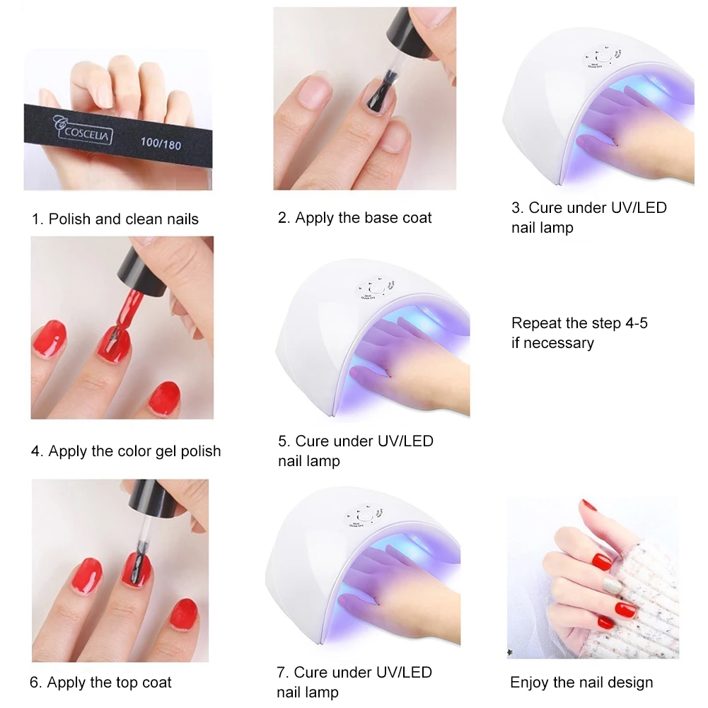 1.-придайте форму поверхности ногтя, очистите кутикулу, для полировки ногтей поверхность и очистите от пыли.2.-нанесите Базовое покрытие COSCELIA (не забудьте закрыть край ногтя).Лечение светодиодная или ультрафиолетовая лампа.3.-нанесите 1-й слой цветного покрытия COSCELIA.Лечение светодиодная или ультрафиолетовая лампа.4.-нанесите еще слой цветного покрытия, если цвет недостаточно яркий.5. Нанесите верхнее покрытие COSCELIA.Лечение светодиодная или ультрафиолетовая лампа.6. Удалите липкие остатки на ногтях с помощью очищающего средства.