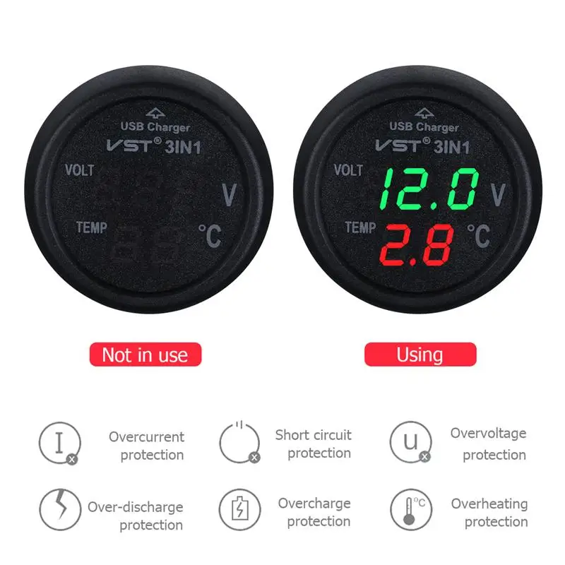 ОписаниеЭто автомобильное зарядное устройство USB с вольтметром и термометром, компактная портативная форма с одним USB-портом для зарядки смартфонов, GPS-навигации, планшетов и т. д. И с вольтметром с ЖК-дисплеем для гарантии безопасности автомобилей. Кроме того, с термометром для наблюдения температуры. Идеально подходит для автомобилей, автобусов, грузовиков и т. д.Особенности:Многофункциональный автомобильный ЖК-цифровой дисплей; Легко установить без профессиональных навыков;Бортовое зарядное устройство, мониторинг температуры и напряжения автомобиля в реальном времени;Специальный автомобильный термометр со стильным и легким дизайном;Светодиодный двойной цифровой термометр, вольтметр;Цифровой термометр для аккумулятора 12 В/24 В с диапазоном измерения 9 ~ 80 °C;Просто вставьте гнездо зарядного устройства, которое сразу же подтвердит напряжение аккумулятора, низкое энергопотребление и дисплей высокой яркости;Характеристики:Тип: Автомобильный вольтметр, термометр, USB-зарядное устройствоНомер модели: VST-706Материал: АБС-пластик + электронные компонентыНапряжение: вВыход USB: 5 В/2,1 АДисплей: цифровой дисплейДиапазон измерения: 9 ~ 80 °CМесто установки: салон автомобиляМарка/Модель автомобиля: УниверсальнаяЦвет продукта: черныйЦвет дисплея: красный + красный, красный + синий, красный + зеленыйРазмер продукта: 75x47x47 мм/2,95x1,85x1,85"