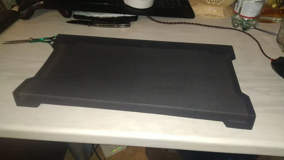 Сетка пришла скрученная в рулон без какой либо защиты от замятия, однако повреждения при транспортировке не получила. Но вот когда развернул рулон то в конце там были замятия. Но сетки с запасом по этому для меня это было не критично. Сетка точно такая как и на корпусе моего системника. Одна сторона слегка шероховатоя. Скотч на магните прилип отлично.
