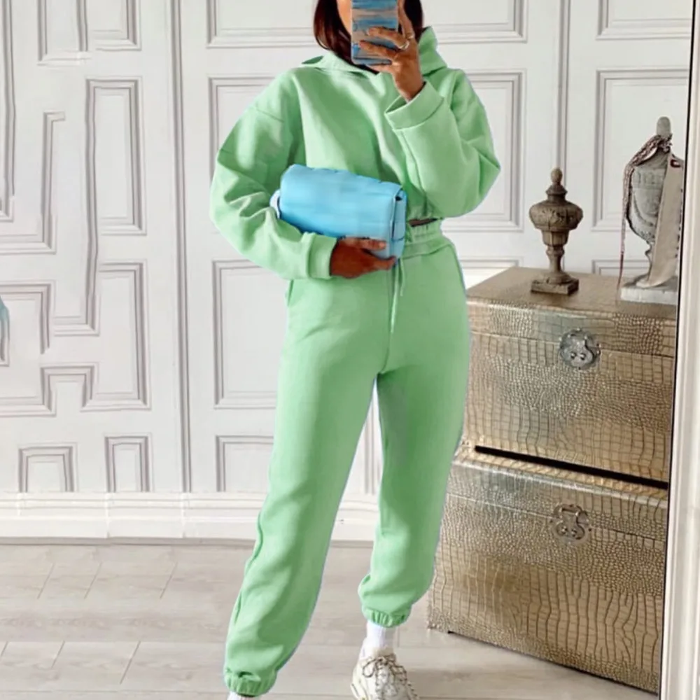 Autumn Winter Two Piece SetNeon Color Women Hoodie Fleece Sweatshirt Crop
