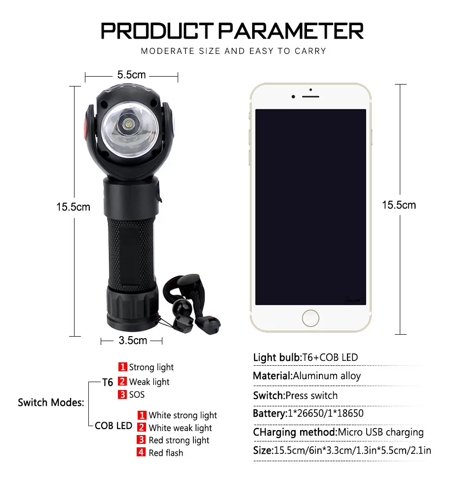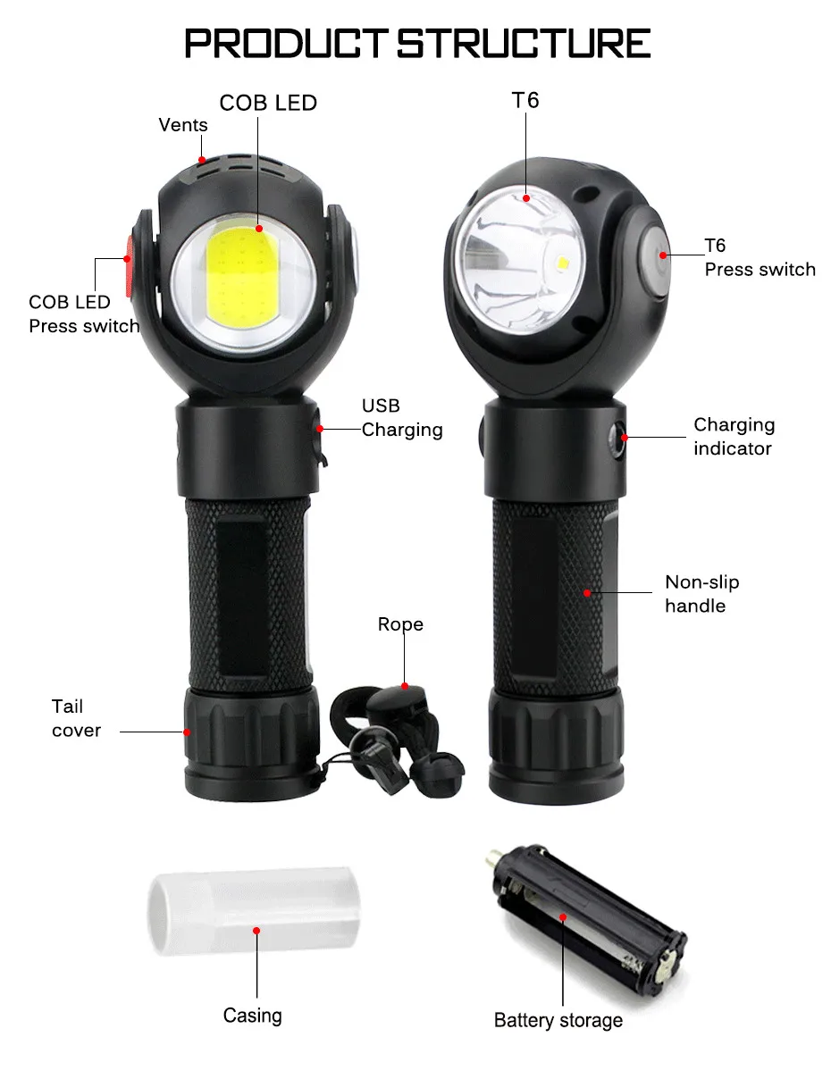 Светодиодный фонарик с перезаряжаемым от USB аккумулятором, рабочий светильник с двойным переключателем, тактический фонарь с магнитом, водонепроницаемый фонарь для кемпинга, 7 режимов