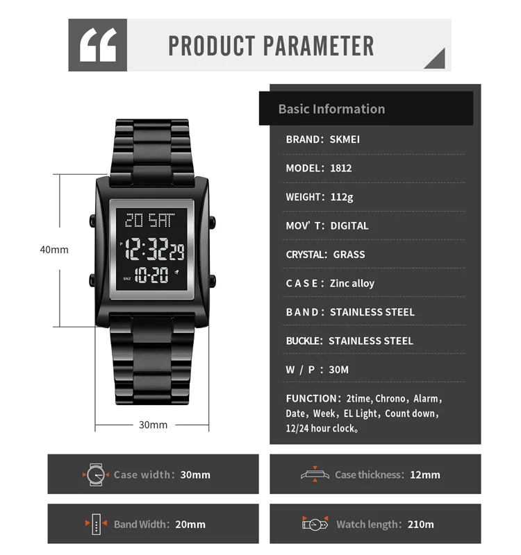 SKMEI Япония движение цифровые часы мужские военные 30 м водонепроницаемый Светодиодный светильник Спортивные часы Chrono отсчет вниз наручные часы Reloj Mujer