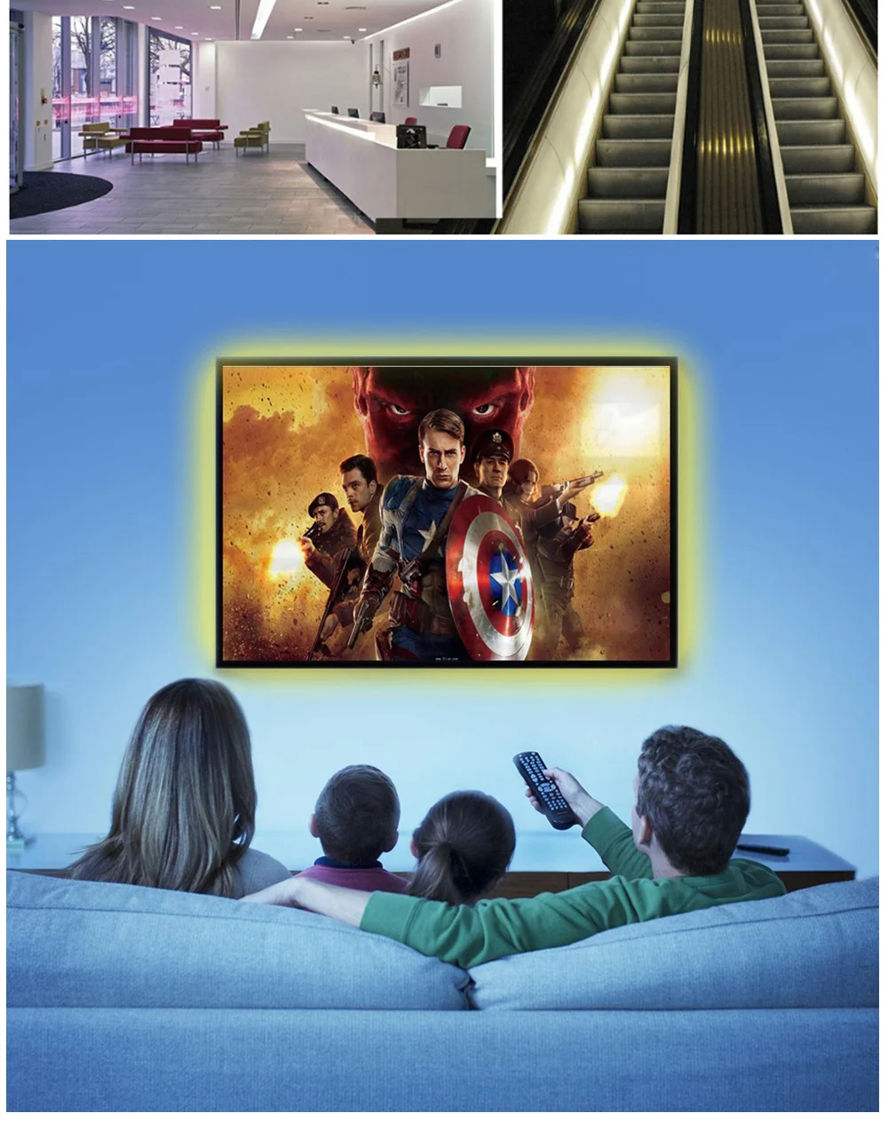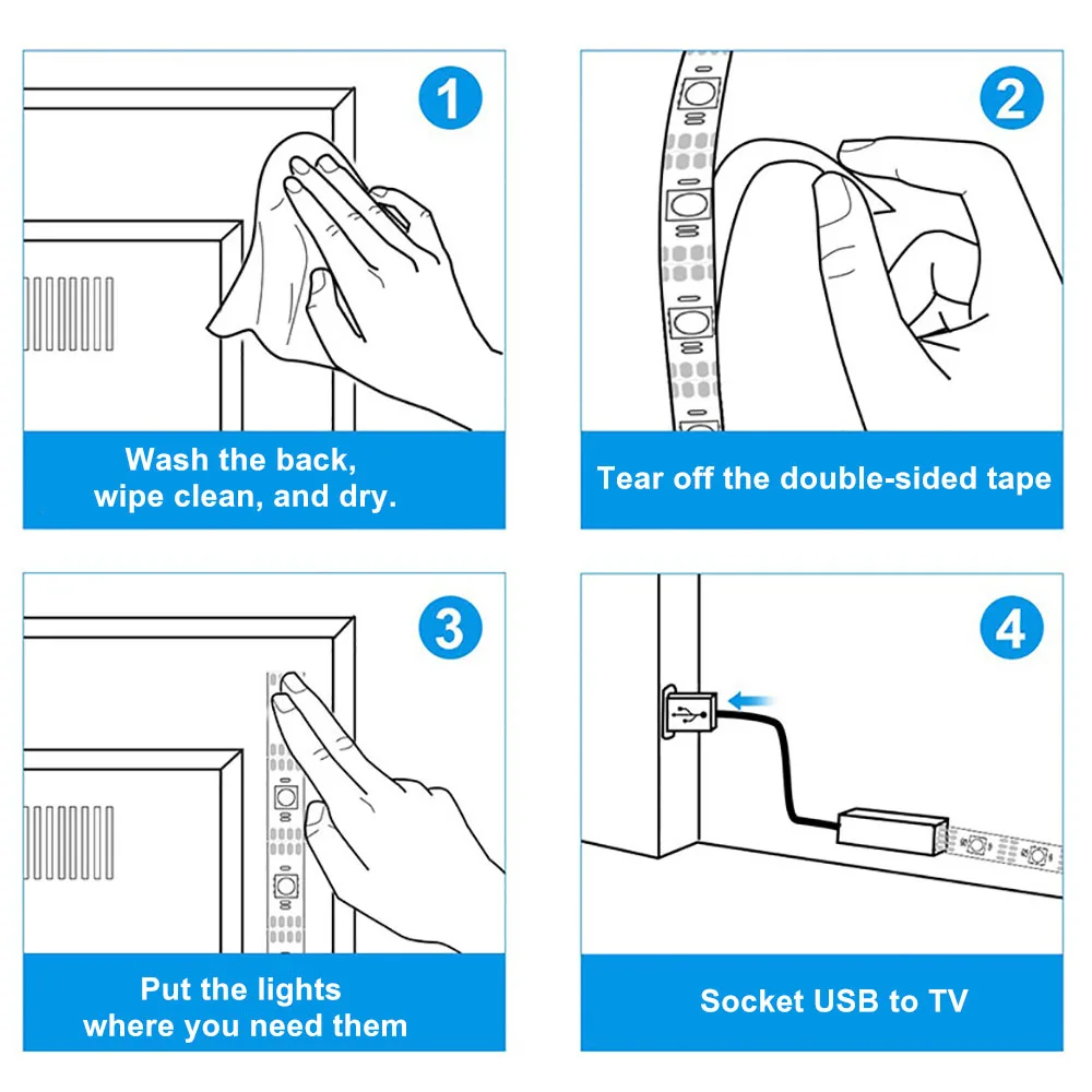 Внимание:1. Очистите пыль, убедитесь, что задняя часть вашего телевизора свободна от пыли перед установкой, чтобы избежать падения.2. Для usb порта электрического тока, который небольшая часть телевизора не может достигать 1А/2а, при вставке светодиодной ленты к usb-порту телевизора, и он иногда не включается или не мигает, вы можете просто использовать универсальное настенное зарядное устройство USB 5 в 1A/2A для питания светодиодной ленты.3. Матовая задняя часть не прочно наклеивается.