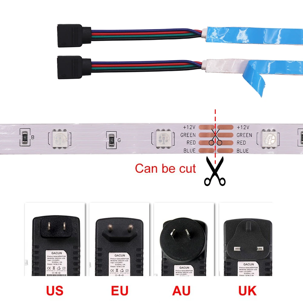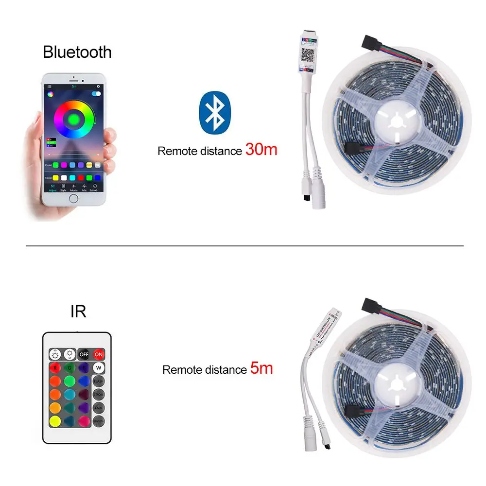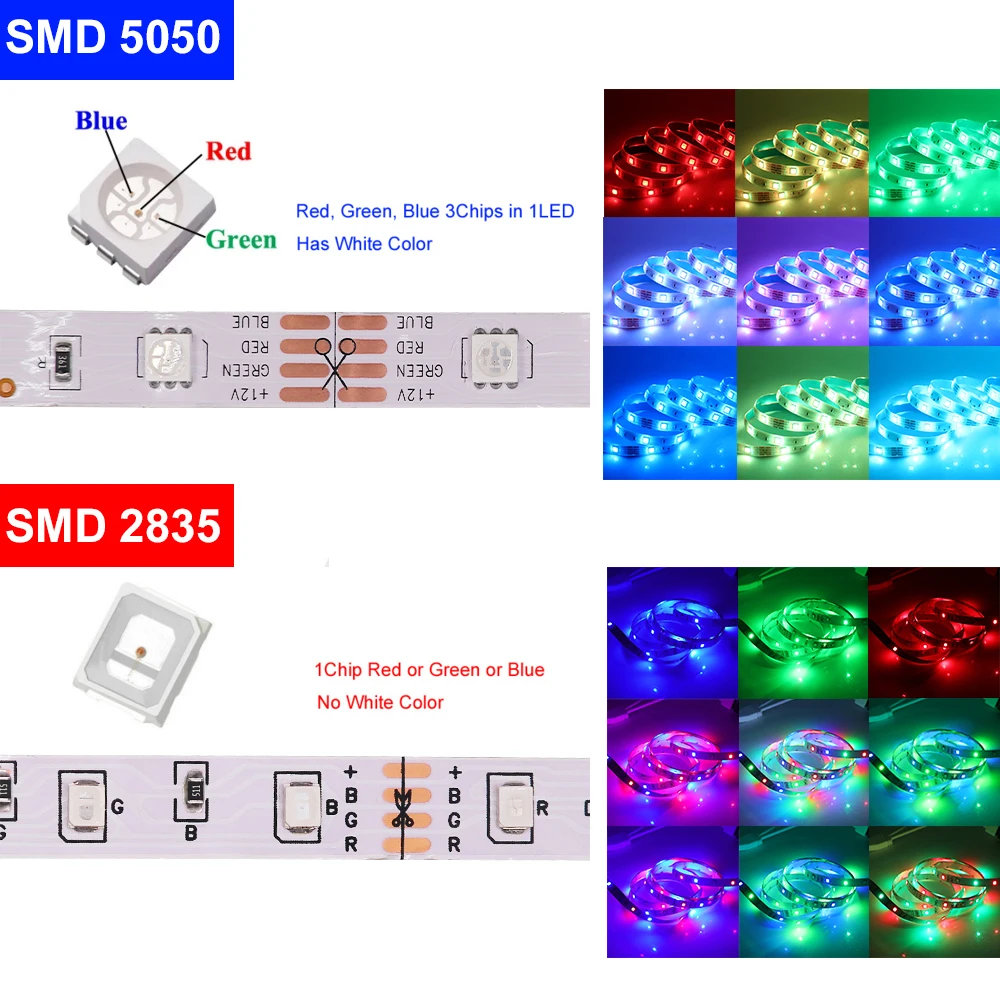 5050 имеет белый цвет, 2835 без белого цвета.Пульт дистанционного управления не включает батареи (CR2025)Количество СВЕТОДИОДНЫЙ: 60 светодиодный s/m (SMD2835) ,30 светодиодный s/m (SMD5050)Метод управления: инфракрасный пульт дистанционного управления/управление через приложение BluetoothРасстояние управления: инфракрасный пульт дистанционного управления 5 м/Bluetooth приложение 30 мКласс водонепроницаемости: не водонепроницаемый IP20/водонепроницаемый IP65Можно резать: Да, каждый 3 светодиода можно разрезатьГибкий: Да, может быть DIY в любой формеРегулировка яркости: ДаТип вилки: штепсельная вилка EU/US/UK/AU