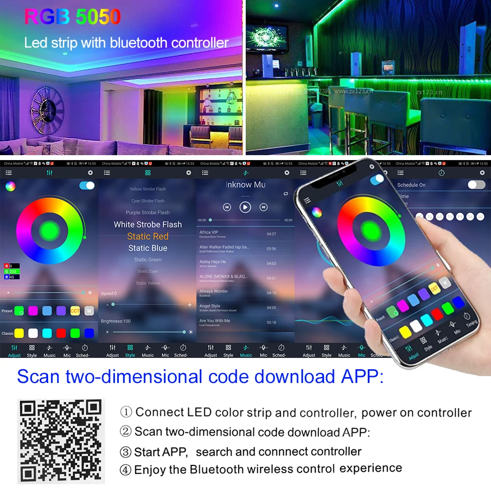 【App приложение управления светодиодный Bluetooth RGB светодиодный Strips】The RGB светодиодный полосные осветители для контроля светодиодный через с помощью приложения на телефоне система автоматического управления ", а также входит ПДУ с 24 кнопками дистанционный пульт. Приложение легко тускнеет и переключает светодиодный светильник с полосками; Контроллер легко включается/выключается нажатием кнопки; И новый пульт дистанционного управления обеспечивает лучший светильник для вас!【 Удобная Светодиодная лента RGB с адаптером и режимом управления Bluetooth. Отсканируйте qr-код, чтобы загрузить приложение. Функция памяти делает цвет светодиодных ленточных ламп таким же, как в прошлый раз.【Подходит для многих сценических 】 светодиодная веревка используется для украшения дома, вечеринки, дня рождения, клуба, столовой, спальни, кельинга, под шкафом, наверху, на кухне, на крыльце, на столе и в гостиной, особенно отлично подходит для праздников и мероприятий, таких как Рождество, Хэллоуин, что является отличным подарком для семьи и друзей.