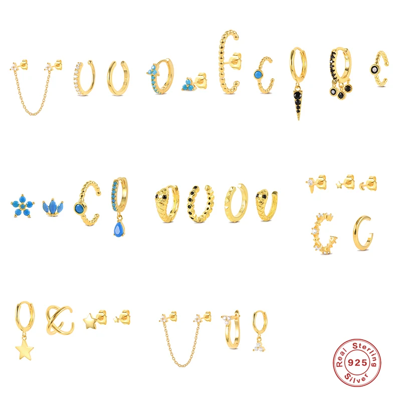 3/4/5 шт 925 серебряные серьги набор синяя Бирюзовая Корона Серьги гвоздики подвеска Звезда Луна висячие серьги черный циркон змея клипсы