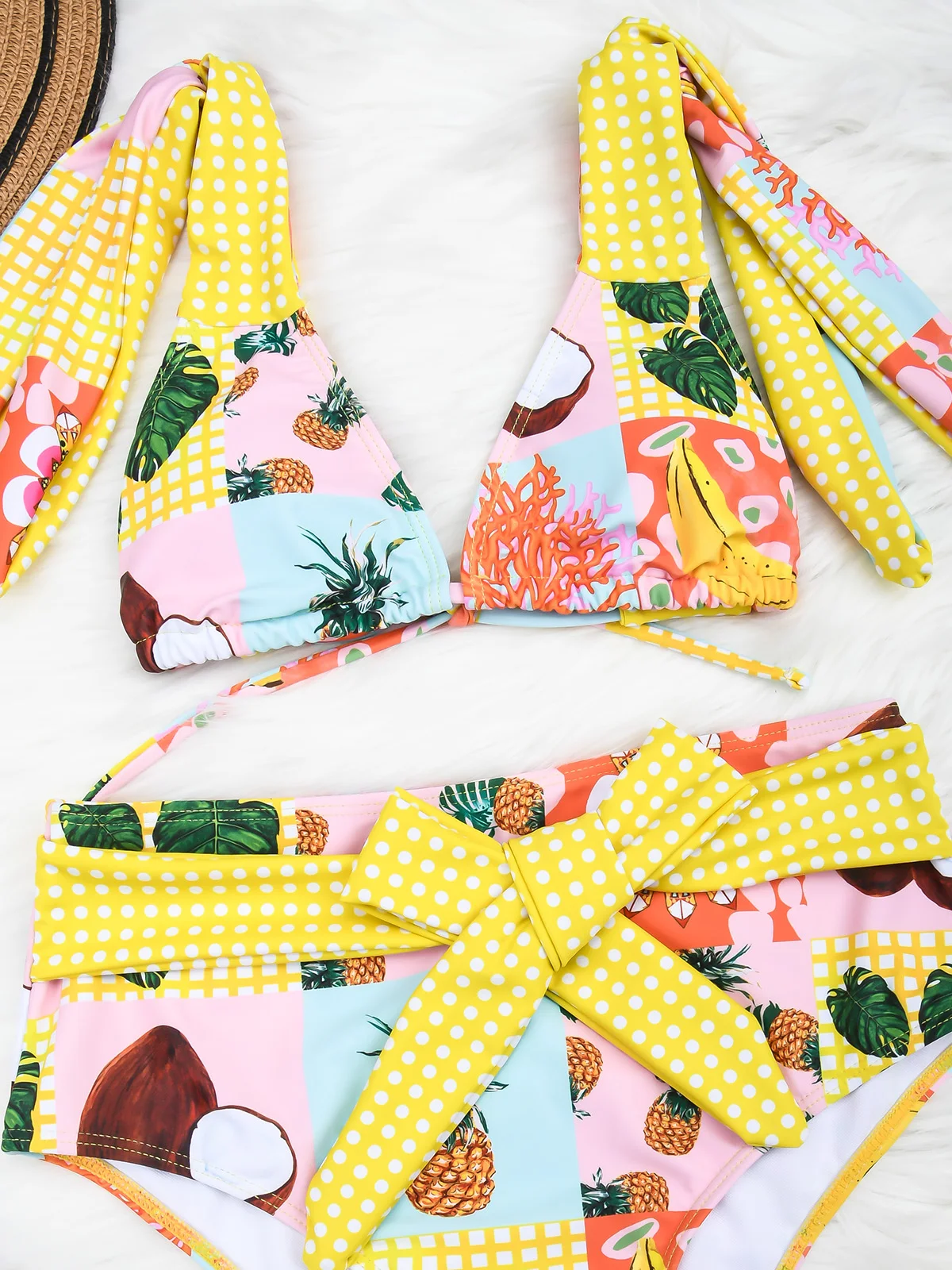 Бикини с высокой талией 2021, сексуальный женский купальник, купальник, Женский бразильский купальник с цветочным принтом, комплект бикини с бантом, бикини, купальный костюм