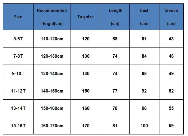 РазмерыРекомендуетсяТегРазмерДлинаБюстРукавВысота (см)(См)(См)(См)От 5 до 6 лет110-120 см120688143От 7 до 8 лет120-130 см130748446От 9 до 10 лет130-140 см14074884911-12T140-150 см15077925213-14T150-160 см16078965515-16T160-170 см1708110059