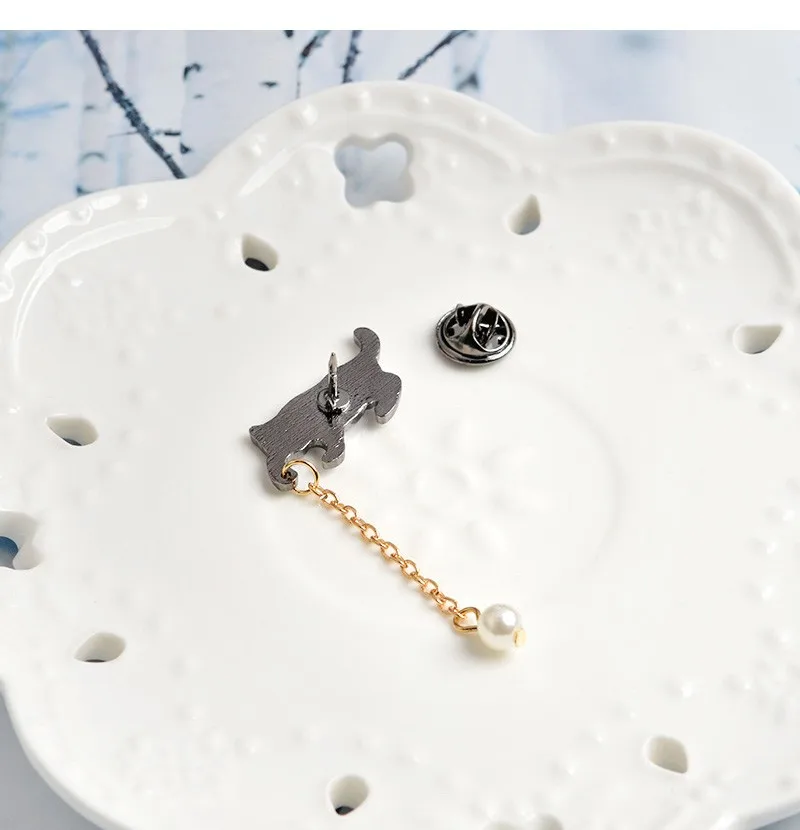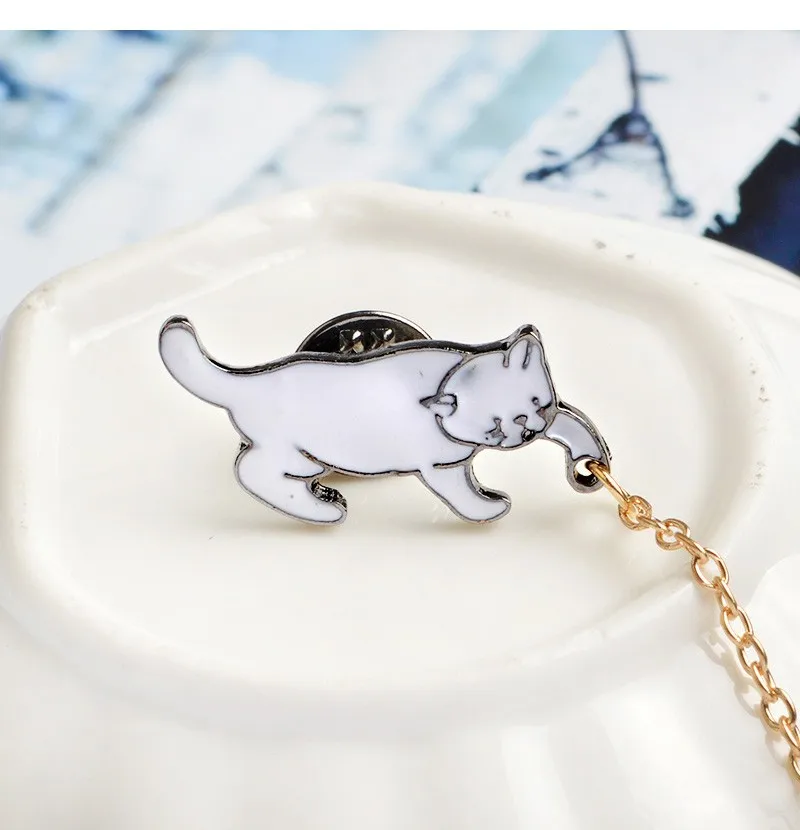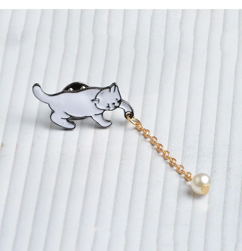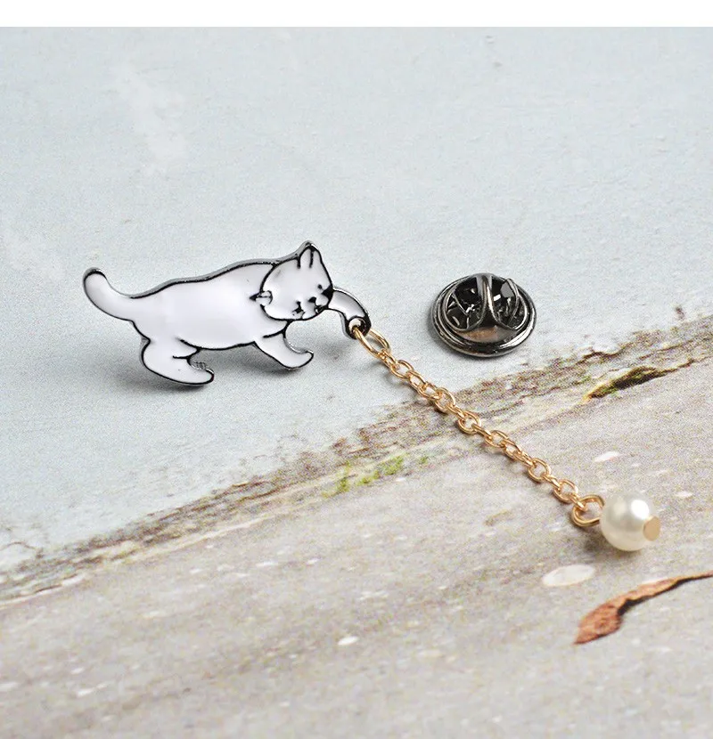 Значки на лацкан с эмалью, в виде белого кота и жемчуга, с цепочкой
