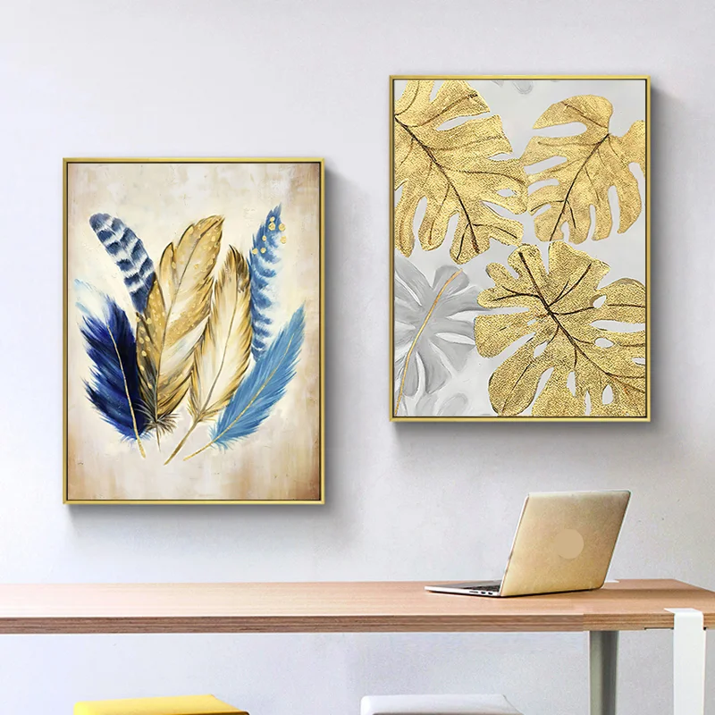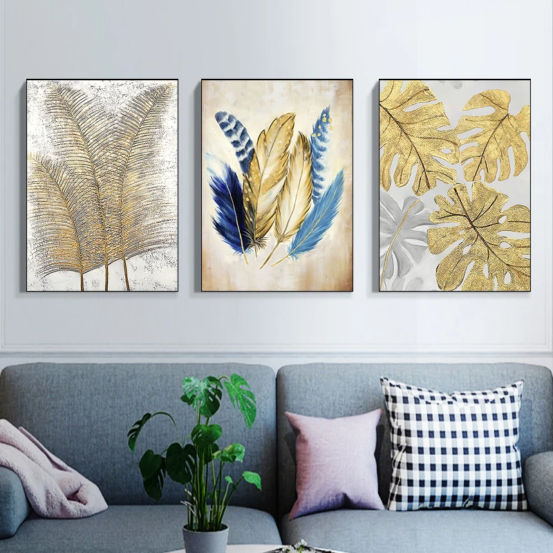 Современная Картина на холсте с изображением золотых листьев растений, настенные плакаты с голубыми перьями в скандинавском стиле, картина для гостиной, декоративные картины