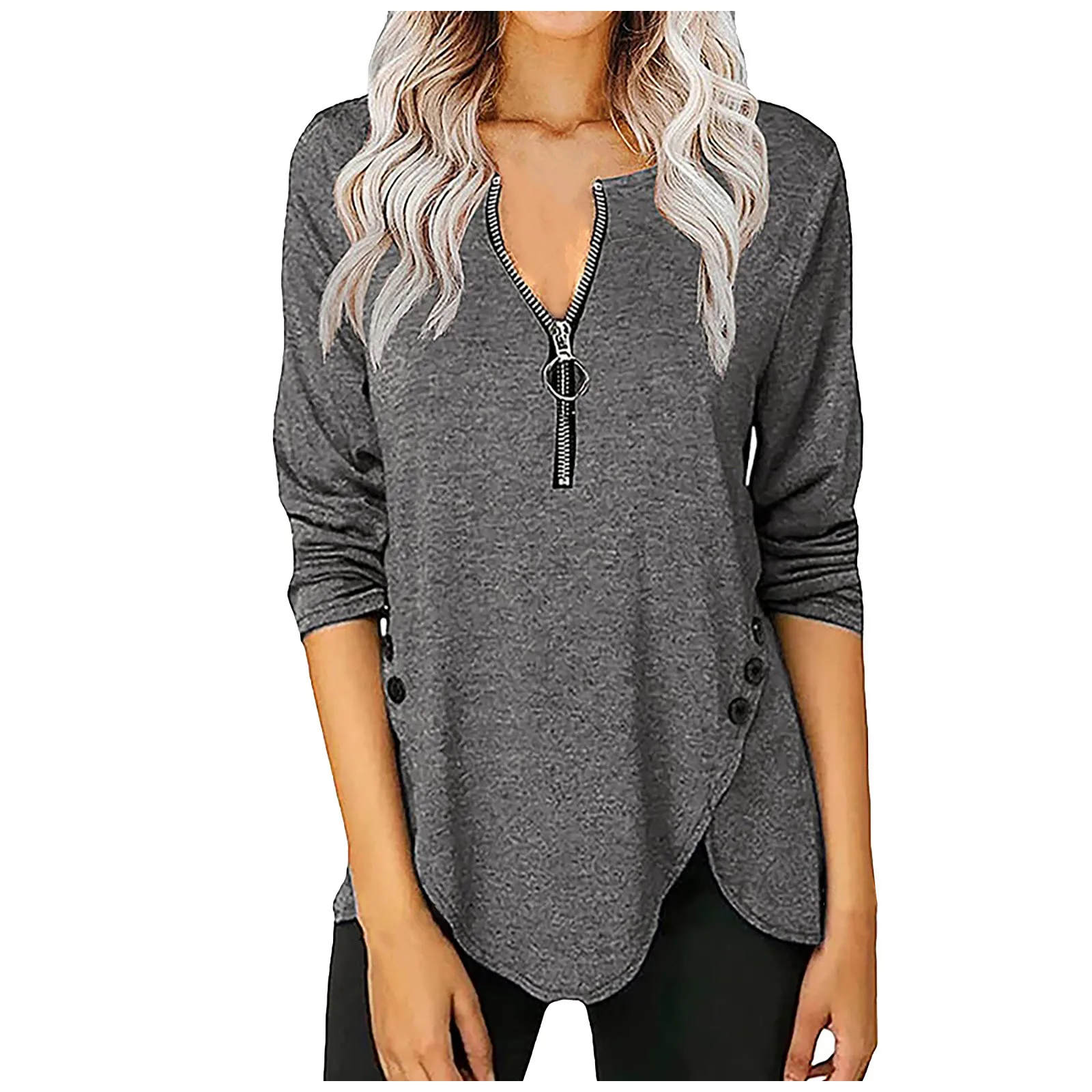 Женская Повседневная Осенняя футболка на молнии с длинными рукавами и v-образным вырезом на пуговицах