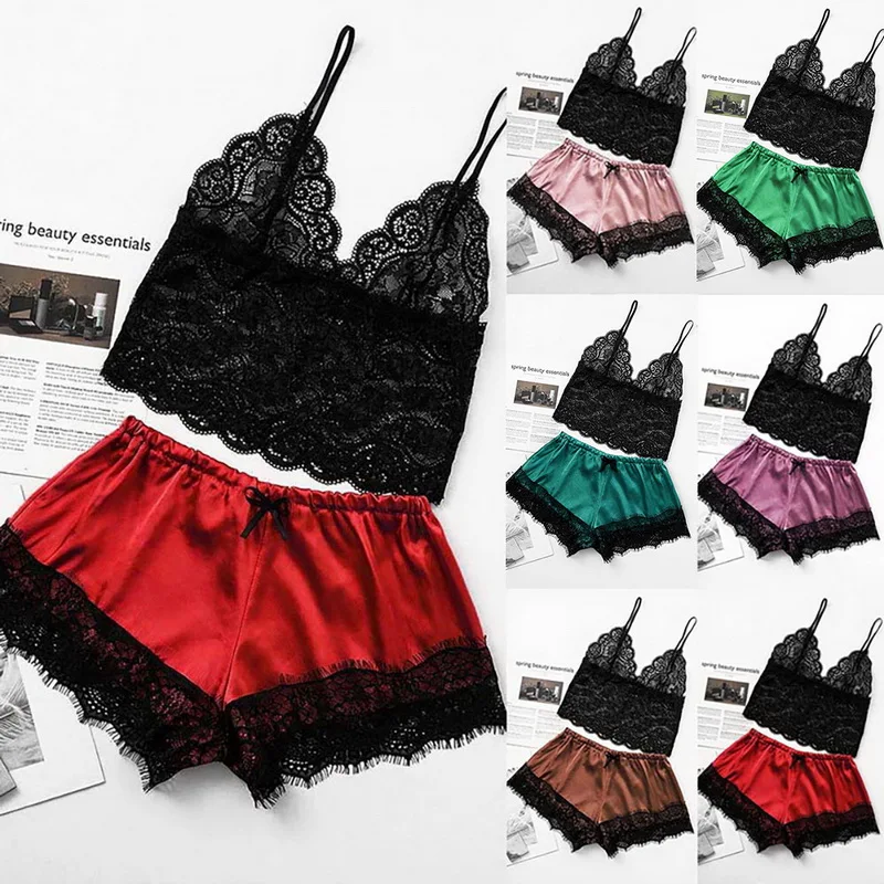 Женская пижама, Сексуальный Атласный пижамный комплект, Черная кружевная Пижама с V-образным вырезом, без рукавов, милый топ на бретельках и шорты, сексуальный женское белье для домашней носки