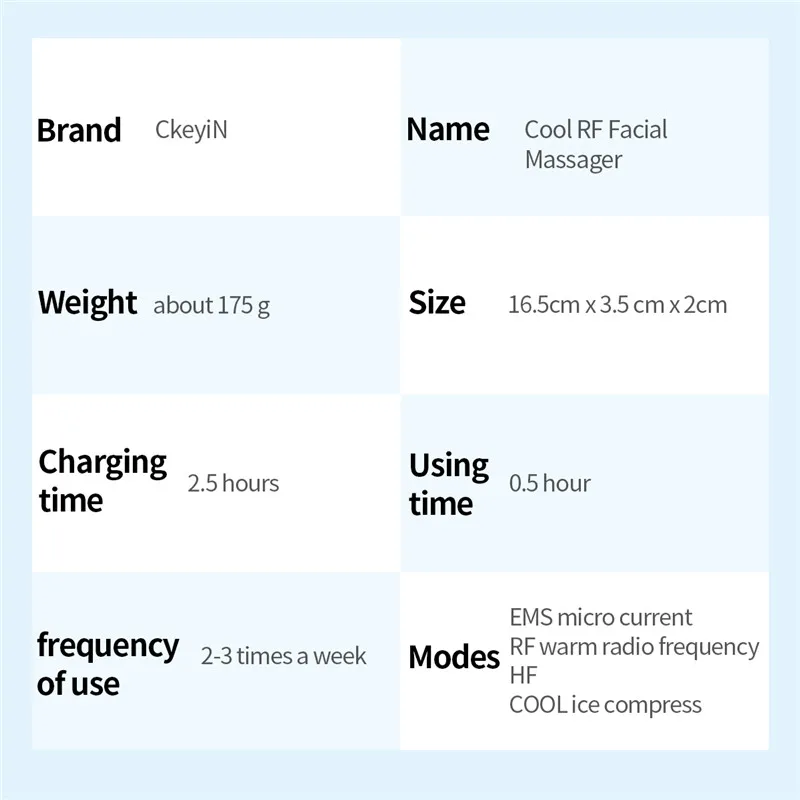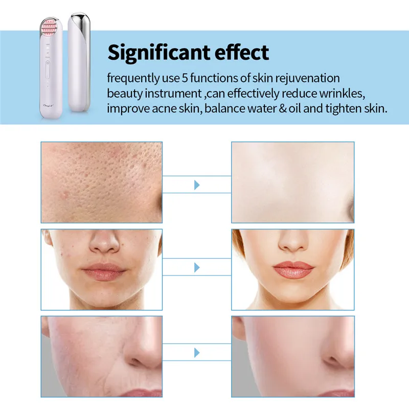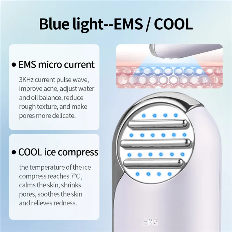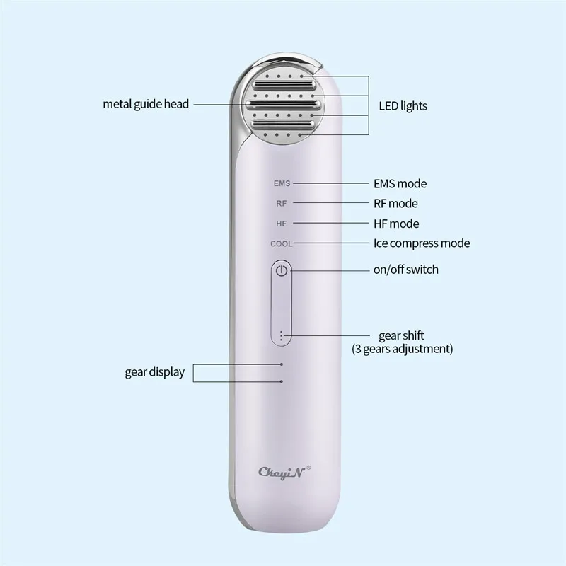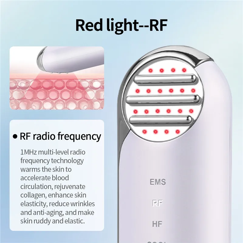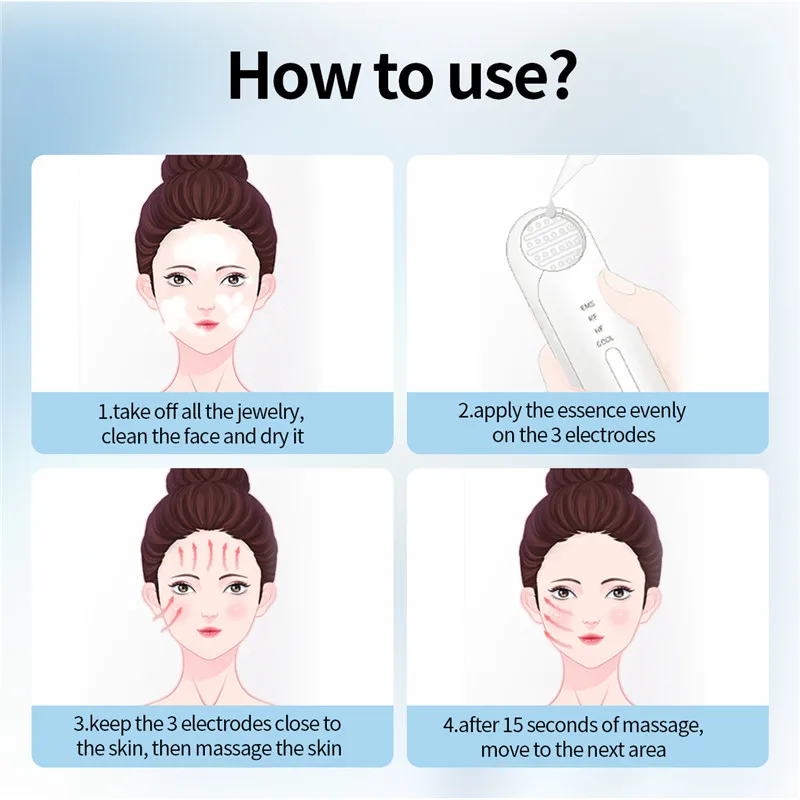 4 режима и 3 лампы:1. Режим микротока EMS + светильник: улучшает состояние акне и уменьшает поры.2. RF теплый радиочастотный режим + светильник: стимулирует выработку коллагена и уменьшает морщины3. Режим HF + красный и синий светильник: уменьшает морщины, сопротивляется старению и стимулирует рост коллагена, укрепляет или подтягивает кожу4. Холодный режим + синий светильник: успокаивает кожу, уменьшает воспаления и удаляет акнеПримечание:Рекомендуется использовать с холодным гелем для лица, после использования лучше наносить маску для лица.Радиочастотную функцию рекомендуется использовать 2-3 раза в неделю, 15 минут за раз.Функцию EMS можно использовать каждый день.