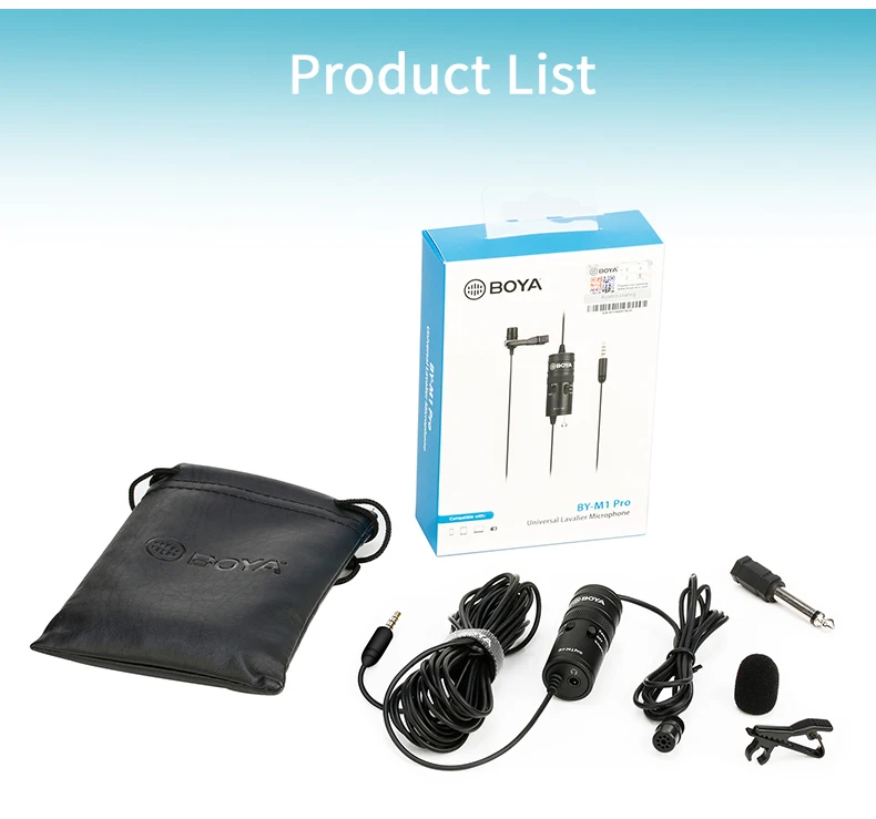 1 * BY-M1 Pro петличный микрофон1 * поролоновое ветровое стекло1 * зажим для одежды1 * Липучка1 * Аккумулятор (LR44)1 * чехол для переноски1 * Руководство пользователяОригинальная посылка от производителя