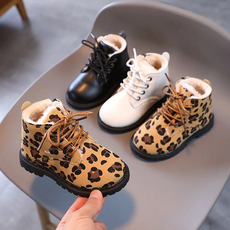 Детские кожаные ботинки с леопардовым принтом, Осень-зима 2021, новые детские ботинки для мальчиков и девочек с бархатной подкладкой, повседневные милые зимние ботинки на платформе, E08214