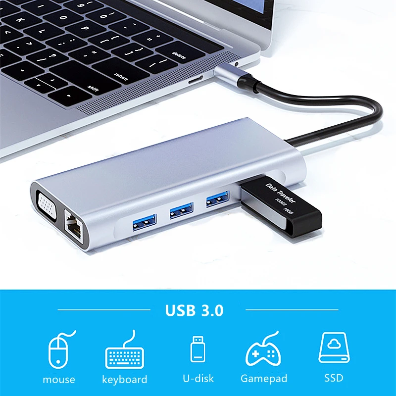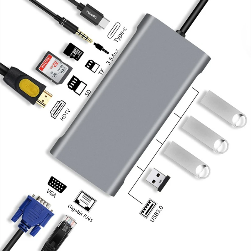 Док-станция Rankman типа C Thunderbolt 3-Gigabit RJ45 HDMI-совместимая с VGA SD TF USB C 3,0 для MacBook Samsung S21 Dex Xiaomi 10 TV