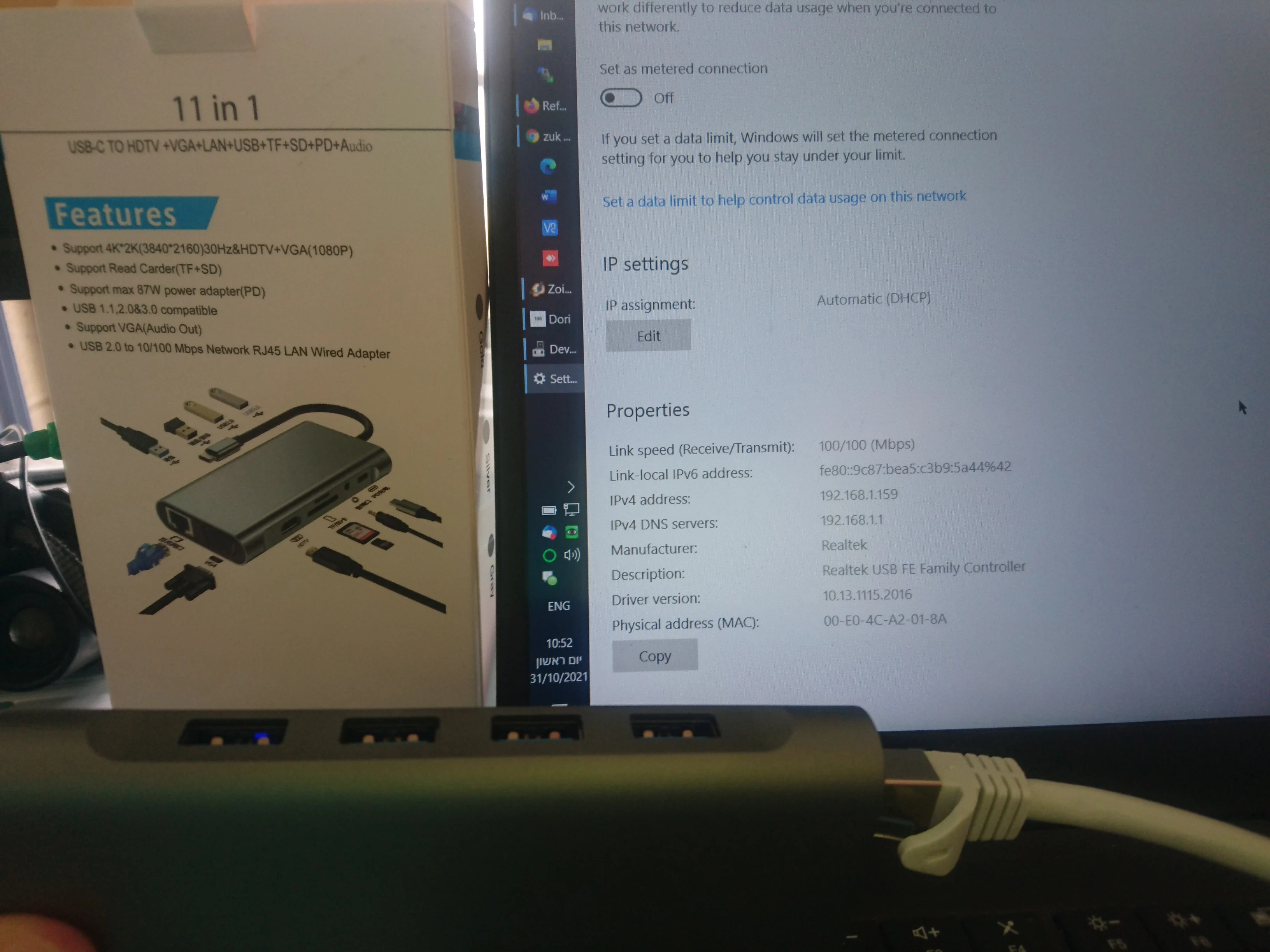 Ethernet advertised as 1Gb but is actually 100Mb. The box says 100, I connect it to the same cable that gives 1Gb with another USB card but only gets 100Mb. The sellers blame everybody but themself and say the writing on the box is nothing and that my cable and router are the problem. I would definitely not deal with them again. Attached are screen pics of Rankmans device showing 100Mb while a different product on same PC with same cable showing 1Gb.