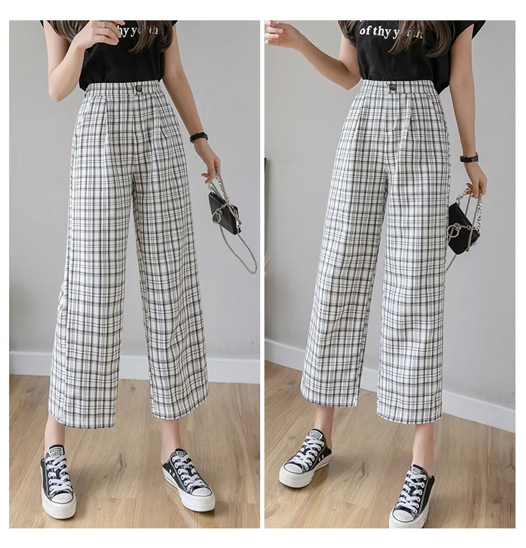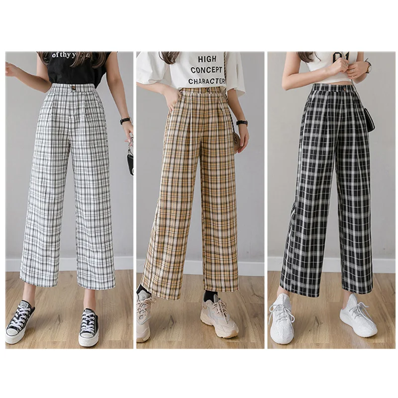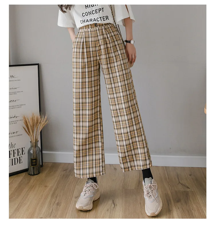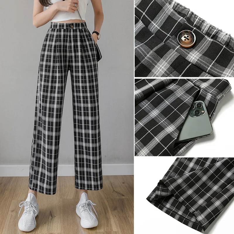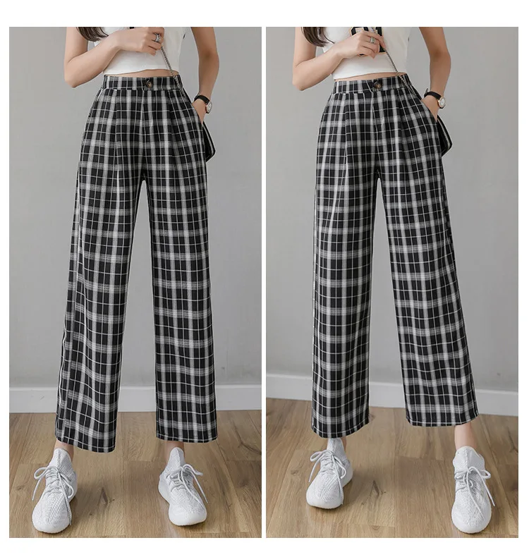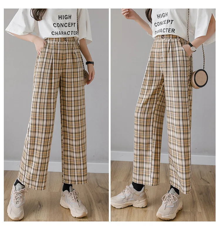 Брюки женские клетчатые с принтом, винтажные повседневные Модные свободные штаны в Корейском стиле, уличная одежда с завышенной талией и широкими штанинами, весна-лето