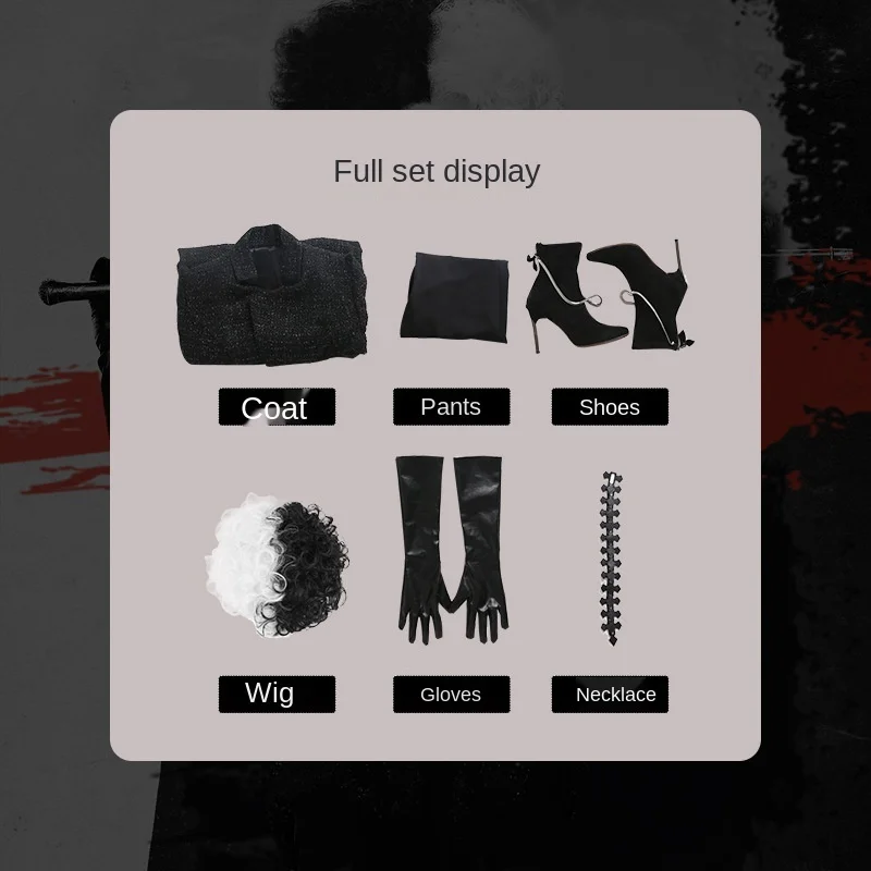 Костюм Cruella COS, черная ветровка, куртка Cospaly Cruella De Vil, полный комплект, европейские фильмы, для вечевечерние НКИ на Хэллоуин, Женский комплект